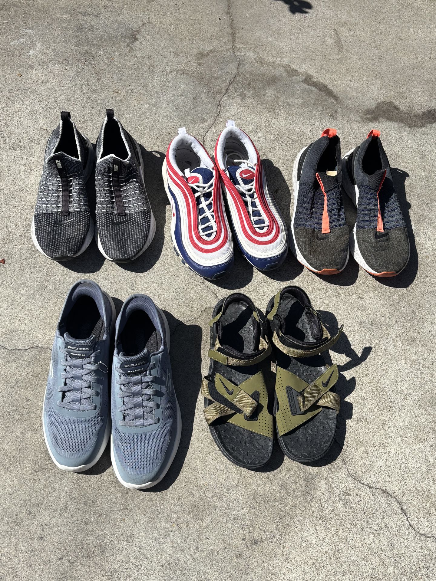 1.Gray Nike React Phantom Run Flyknit https://offerup.com/redirect/?o=Mi5OaWtl Air Max 97 “USA” 3. Nike React Phantom Run Flyknit 4.Skechers Men’s Bounder 2.0 Emerged Trainers https://offerup.com/redirect/?o=NS5OaWtl AGC Air Destchutz+ Sandals $40 each. * Size 13*