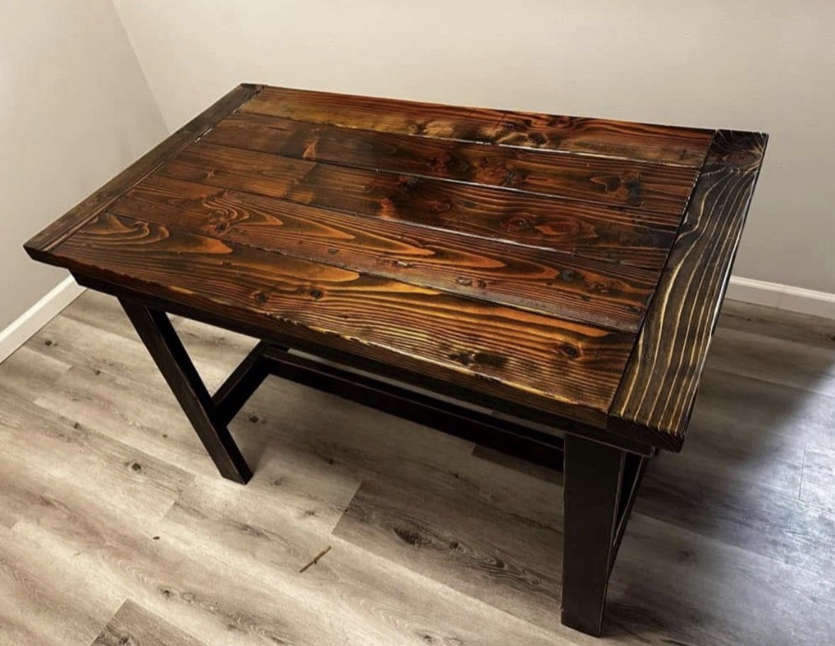 Cash Only | Firm Price | Thank You! Bring a touch of artisanal craftsmanship and rustic charm to your dining space with this striking farmhouse set. Table: New, Never used - • Custom ordered industrial rustic farmhouse design • Shou Sugi Ban (Yakisugi) charred finish on Red Cedar wood, for durability, natural beauty, and a unique aesthetic • Distressed base for authentic vintage character • Dimensions: 47.75”W x 27.5”D x 34.76”H (counter-height) • Sturdy, high-quality construction with ample surface space Chairs (2): In Great Condition - • World Market distressed bistro dining chairs in Blackwash finish • Dimensions: 20.1”W x 21.3”D x 37.8”H • Seat height: 24” (ideal for counter-height table) • Comfortable, durable, and stylish with foot rail