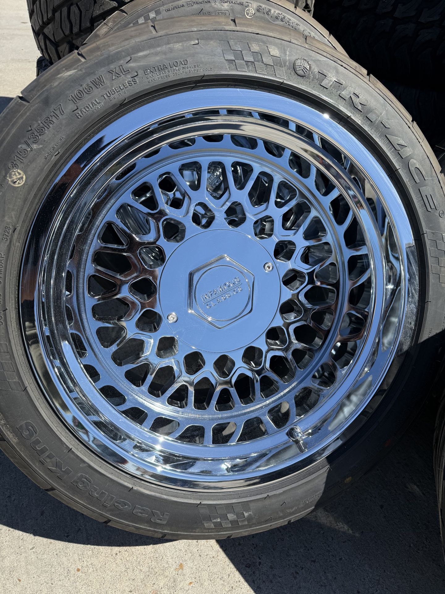 New 17"x11 5x127 chrome rims with TriAce 315-35-17 tires for $2700. Ready to be installed onto your vehicle! Come into Big Boys Tires and Wheels #3 in Santa Fe, TX off FM 1764, and we will put them on