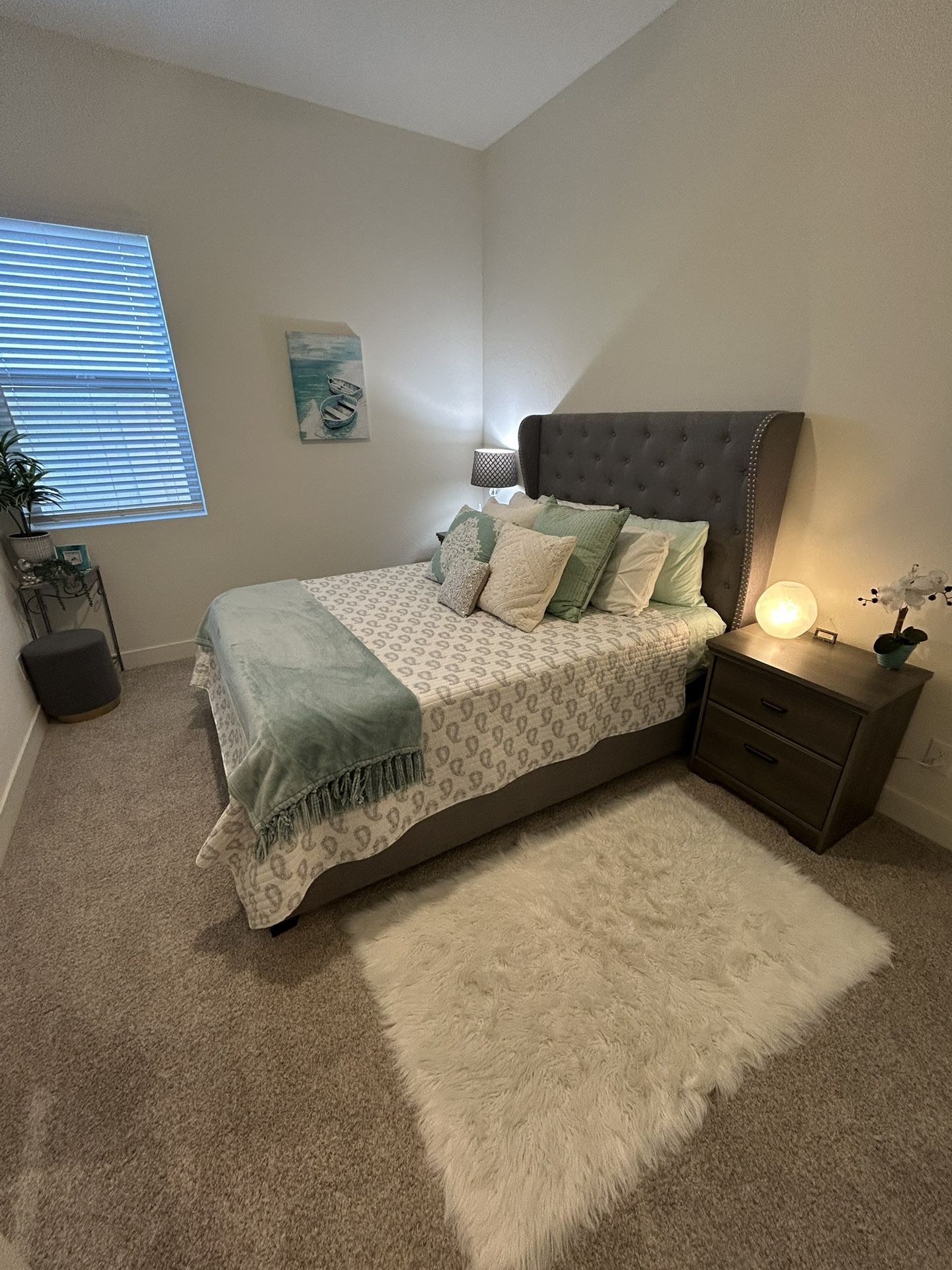 Gray winged bedframe- Queen (has some cat scratches as shown in photos, does not come with box spring or mattress) Two Lamps Corner table Vase and plant Stool Rug All throw pillows Picture on wall Asking $200 OBO Must pick up