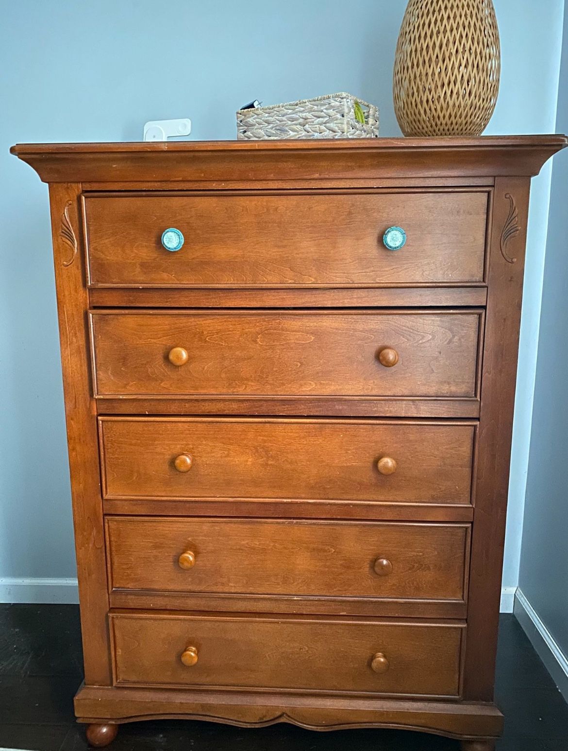 Great quality. Have matching dresser, long dresser. Long dresser has about 3inch long section that had some wood broken off. Due to a move. I did put some wood putty on to fill it in. Did not finish it though. $20 for long dresser