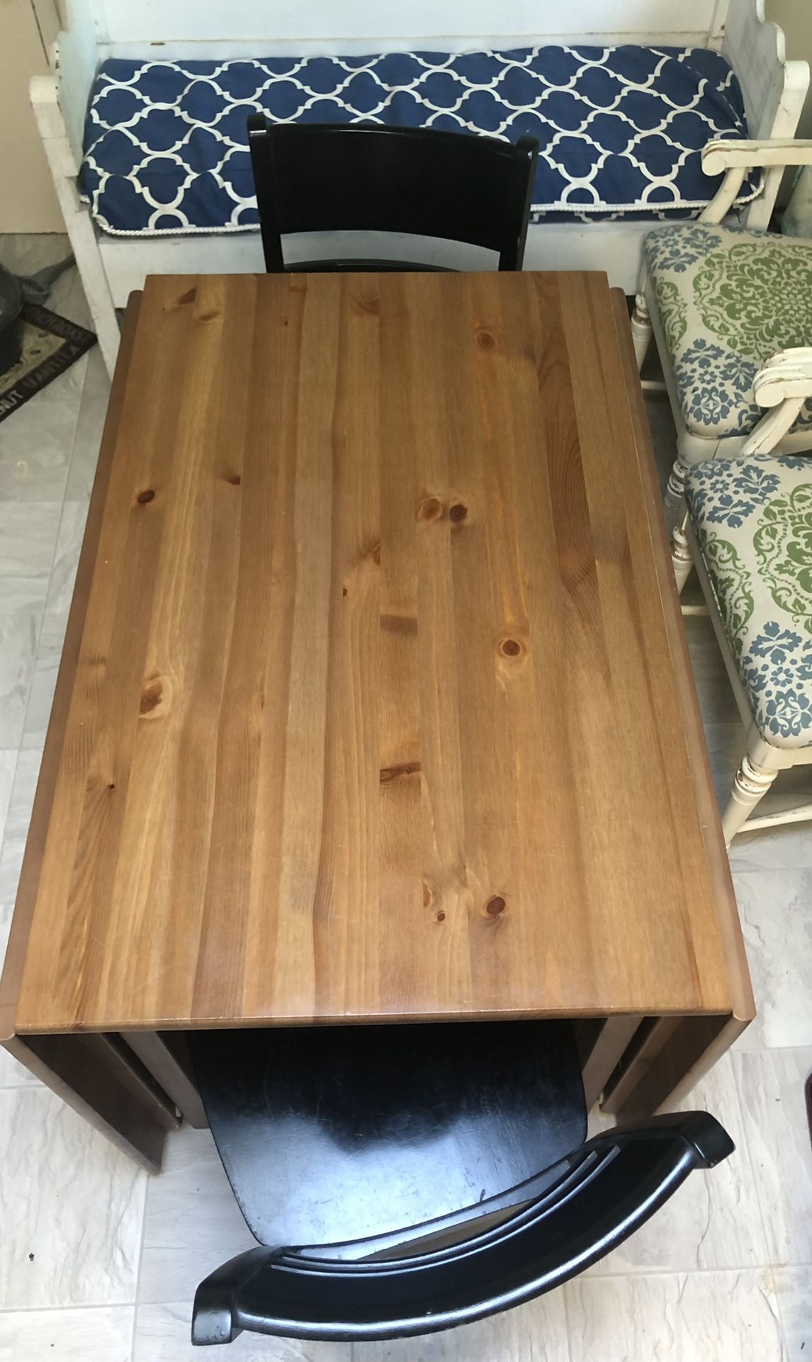 5-Pc. Wood Table, a beautiful pine, with two folding sides and 4-wood black chairs. It can seat from two, when folded to 8 people when you extend out. It’s great to be able to tuck it away or keep out in a dining room. The table and chairs are in great shape.