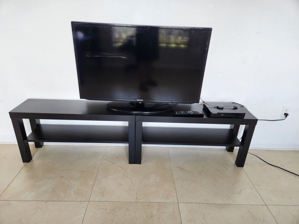 42 inch Samsung TV with blu ray player. All working no issues. Also includes Google home for smart TV apps and both tables pictured. Come today. 246 grifford drive. No holds. Moving needs to go.