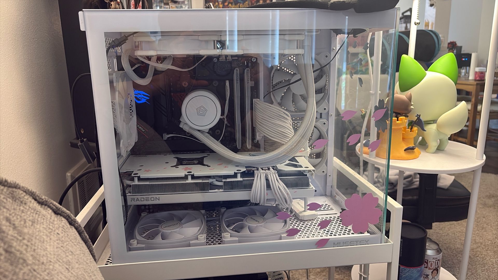 7800 xt graphics card Sakura edition Needs to be cleaned is all Runs well Don’t use it much Firm on price All pieces I used to build runs great Retail $1600+ to build on your own right now