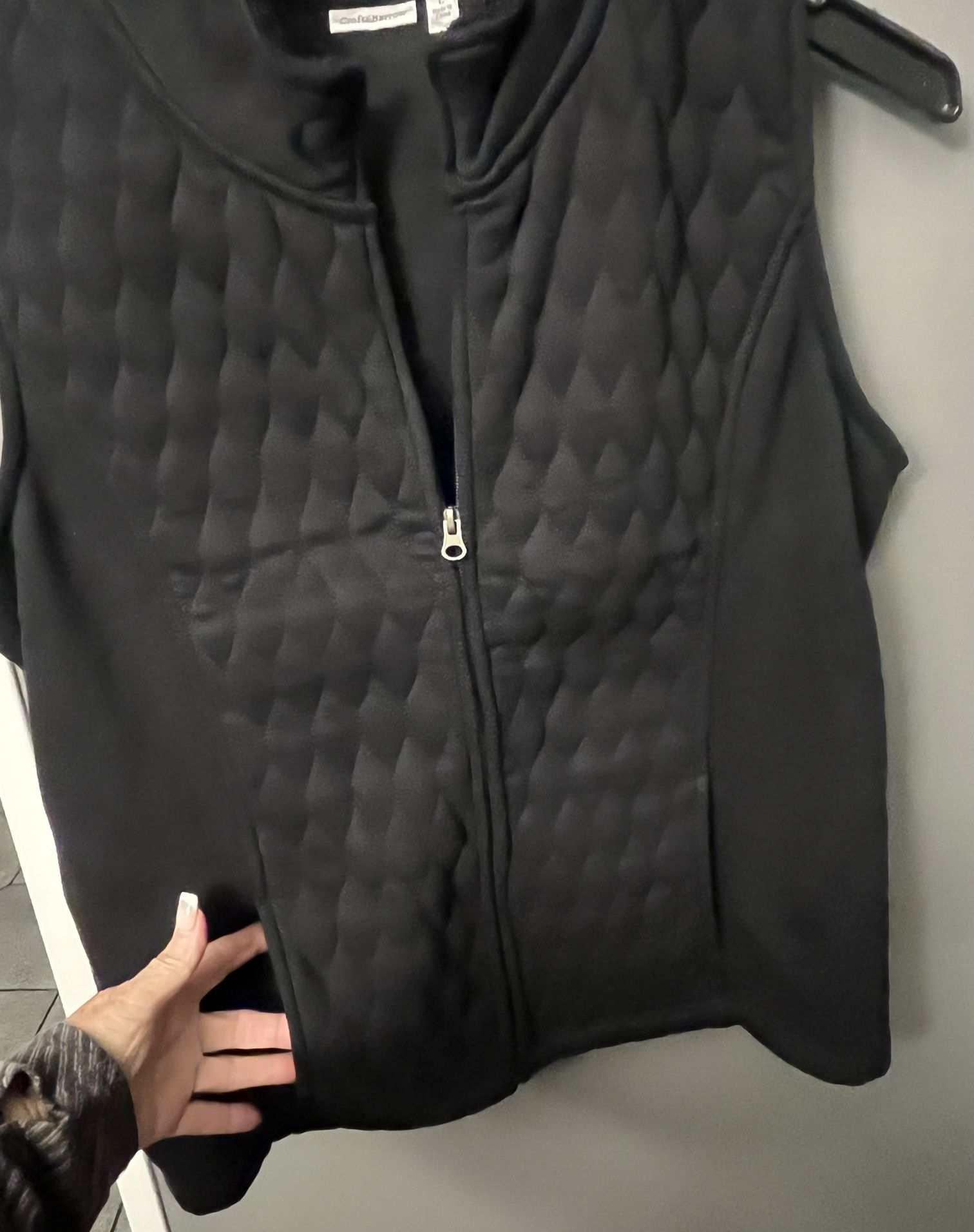 Ladies black Craft & Barrow outdoor Vest, size Large. Zipper front, back and front is quilted, sides have stretch to it, for extra comfort. Two front pockets, also has two inside pockets as well. Lightly used, in perfect condition. Length is approx 25” long and 21” wide!