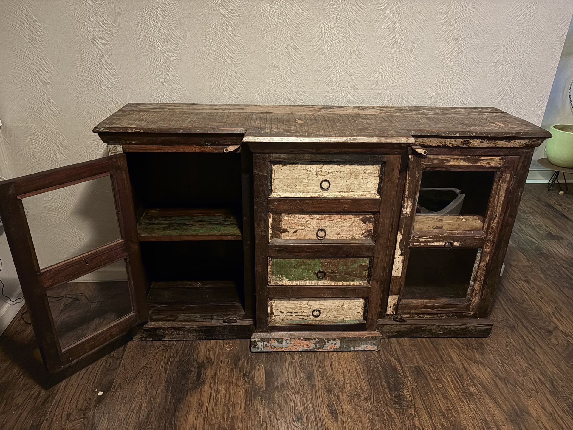 Beautiful rustic hutch made from solid reclaimed wood with lots of character and storage. Features two glass-front cabinets, multiple drawers, and a spacious top surface. Unique distressed finish with natural variation throughout — no two pieces like this. Perfect as a dining room buffet, entry console, media cabinet, or statement storage piece. Heavy, sturdy, and well-made. Selling due to downsizing for a move.