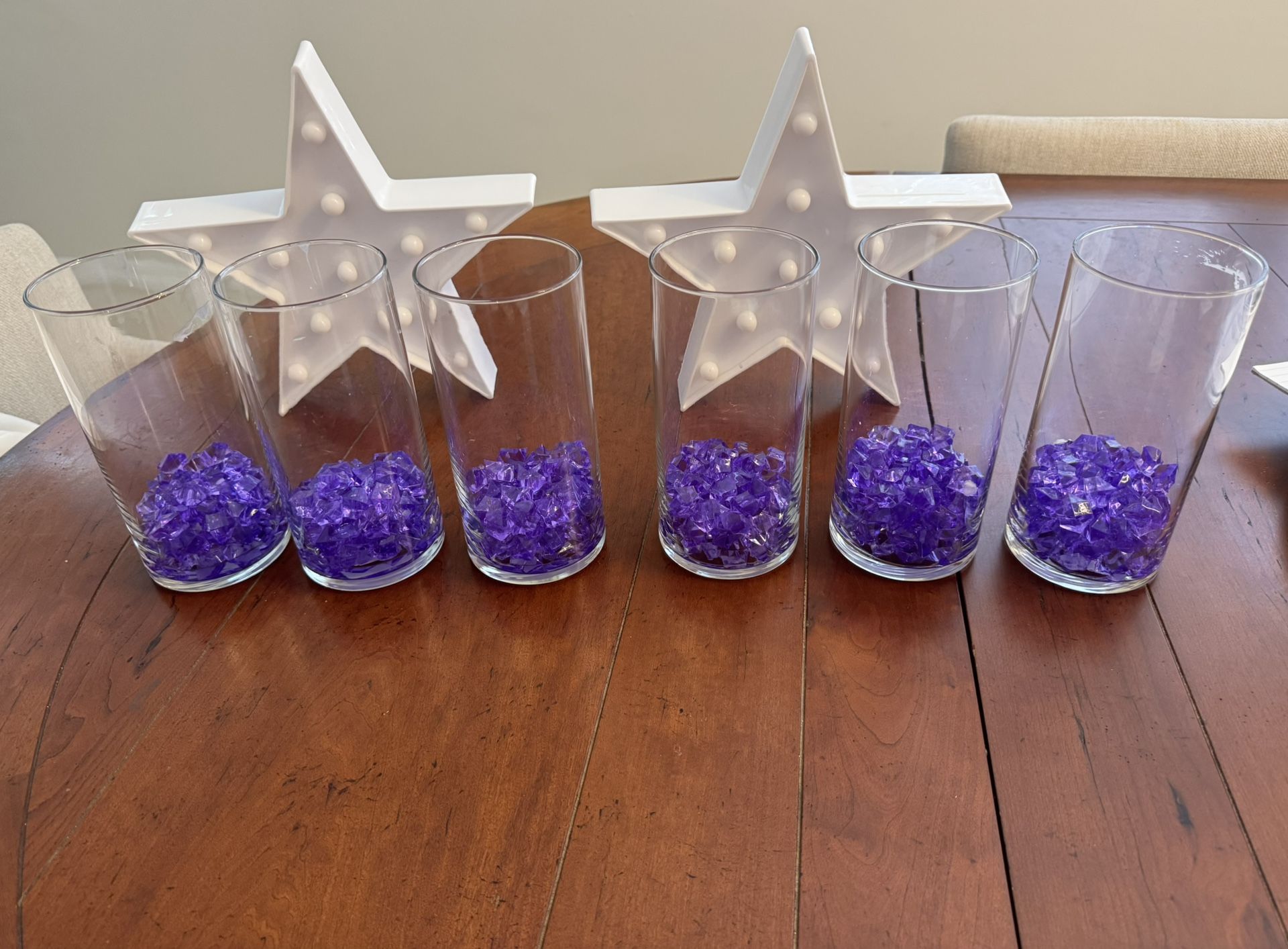 Glass vases 3 1/2” wide x 7” tall Set of six Bit of Wax on a couple rims that can be wiped off (see photo) Ice purple rocks filler included