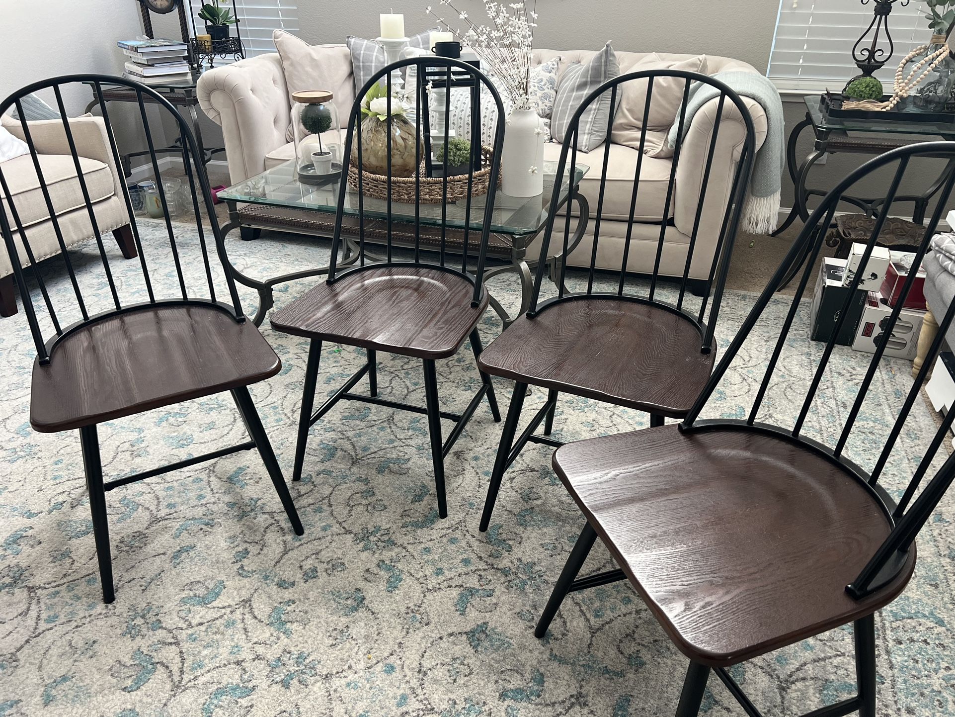 Beautiful set of 6 metal chairs with wood seat. Very comfortable to sit on. Versatile for any type of decor.