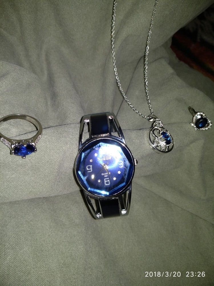 4pc. Brilliant Blue Collection *NEW* 1)2018 New Stylish Dress Watch Bracelet. 2)Silver Plated Necklace new design classic fashion style 18" Link Chain Material: Zircon Metals type:Copper Pendant size:3.2 × 2.0 cm 3) Blue Sapphire & White Topaze size 9 *new* Sterling Silver 925 Stamped 4)Certified 3× Platinum Plated Genuine 5AAAAA level Italian Origin Stone Inlay with over 20 Pure White Stones to compliment the beauty of main Stone. Rich - Sophisticated *new*