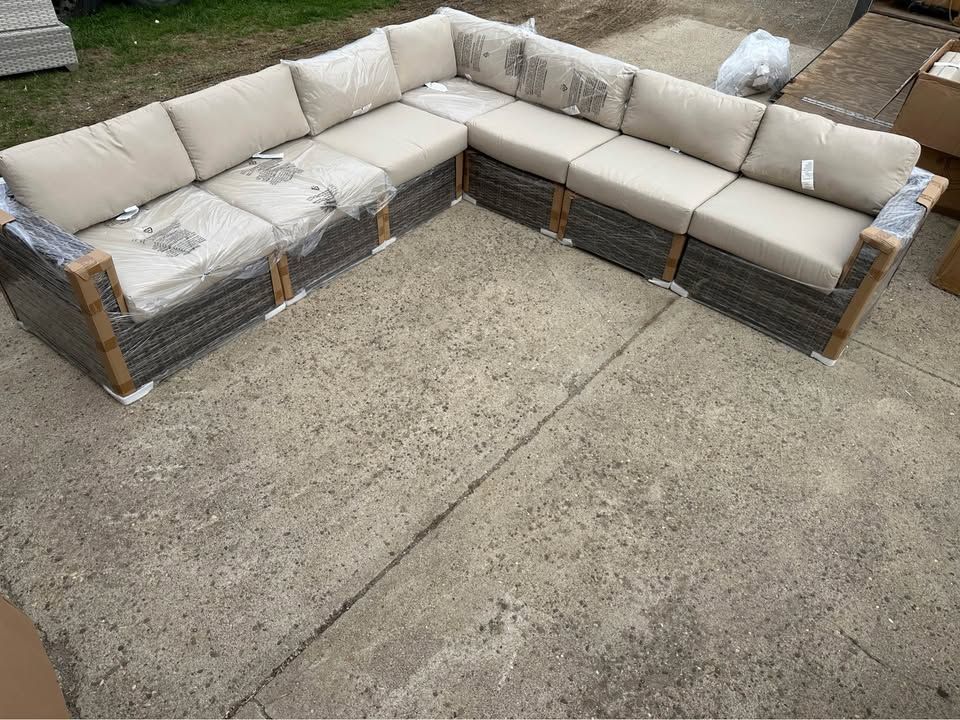 Multiple color options to choose from for the covers (wicker base is the same color/material). All of the colors pictured are available (Beige is primary photo in listing, also black, navy blue, gray & brown). Currently retails for $2339 before tax (on sale). Interlocking furniture clips included. Commercial grade construction. Each seat is a separate piece so it can be made bigger or smaller. I do have extra corner chairs and armless chairs available for sale if you wanted a larger setup. PLEASE READ: DELIVERY DETAILS & ADDITIONAL INFORMATION We carry a large variety of luxury furniture (Four Hands, Birch Lane, Bernhardt), brand name luxury modular couches with a variety of different fabric/colors available and other high-value merchandise. Pm me for more details on the sectionals/sofas. We deliver weekly (usually on Sundays) to the Detroit area, biweekly to Nashville, daily/weekly to Central OH & everywhere in between. Delivery costs are on a case by case basis but generally range from $25-$50. Our warehouse is 30 min east of Columbus OH. For customers who aren’t local but still wish to preview an item before delivery, we can provide additional photos and a short walk-around video when items are pulled for loading so you can confirm condition before delivery. This service is ONLY reserved for confirmed orders once we have received the delivery address. Payment is due upon delivery. All sales are final. Outdoor sectional, patio couch set, backyard furniture, deep seating sofa, large patio furniture, outdoor lounge set, heavy duty patio furniture, modern patio sectional, luxury outdoor seating, brand new patio set