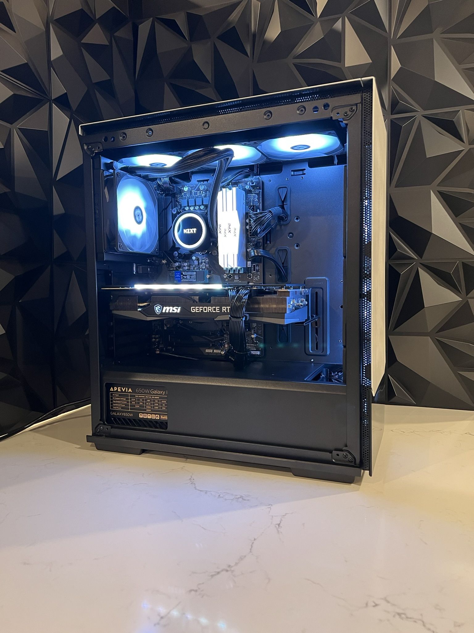 Ready for gaming, school, or work right away. Has a lot of RGB fans… but you can never have enough! This PC runs 1080p and 1440p games in style. Specs: • CPU: Intel i7-11700F (8 cores / 16 threads) • Cooler: NZXT Kraken 120 RGB AIO (brand new) • GPU: MSI RTX 3060 Ti Gaming X TRIO • Motherboard: Gigabyte B560 DS3H AC-Y1 (WiFi) • RAM: 32GB DDR4 3200MHz (4x8GB XPG) • Storage: • 512GB WD Blue SN550 NVMe SSD (boot drive) • 1TB Seagate Barracuda HDD (extra storage) • PSU: Apevia Galaxy 650W (brand new) • OS: Windows 11 installed & activated If you have any questions, please feel free to ask. Cash/Zelle/Venmo/Apple pay accepted No trades, please.