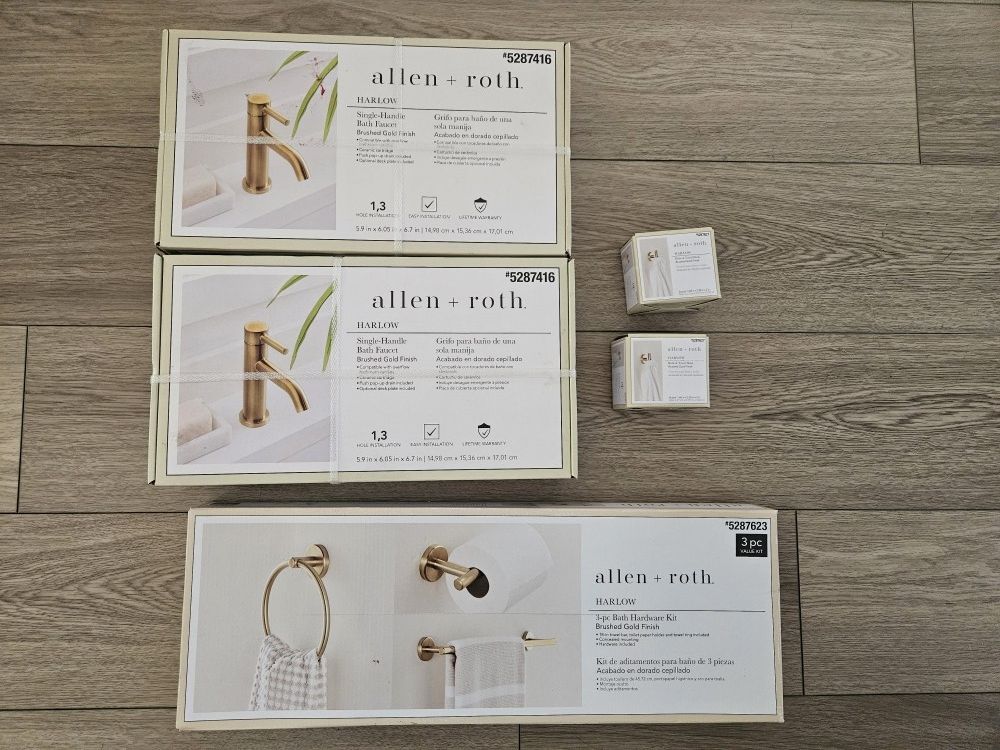 Allen + Roth Harlow Went past return date, all new unopened 2- faucets orig price $118 ea 2- robe hooks paid $23.98 ea 1- 3 piece bathroom hardware set paid $78.98 = $ 362.94 paid without tax
