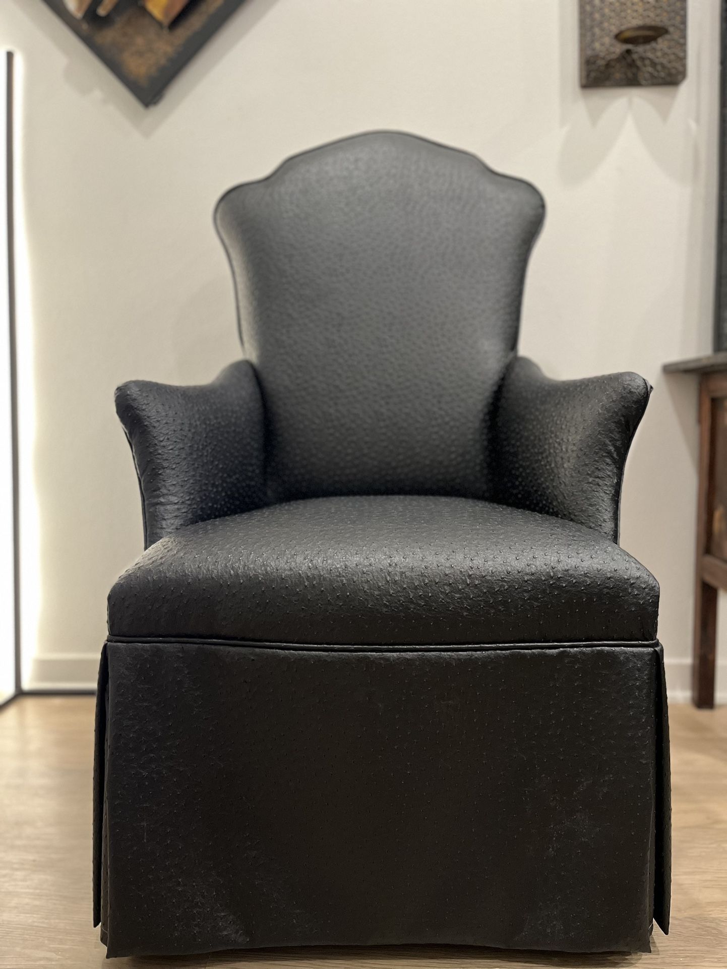 Price is for each! 45.5”H x 28.5” W x 21” D 19.5” Seat Height 26.5” Arm Height Faux Ostrich Detail Leather Floor length skirt with a tall back In beautiful condition - can be sold individually ✨Welcome to Studio Casa Marcella!✨ •Pick up in the Downtown Orlando - Mills 50 Area 32803 •Cash, Zelle, Cash App, Venmo, PayPal Available! •NOTE: All sales are based on a first come first serve basis, and once a deposit is received it is automatically sold. •No holds without a deposit *Delivery available depending on location at an additional cost