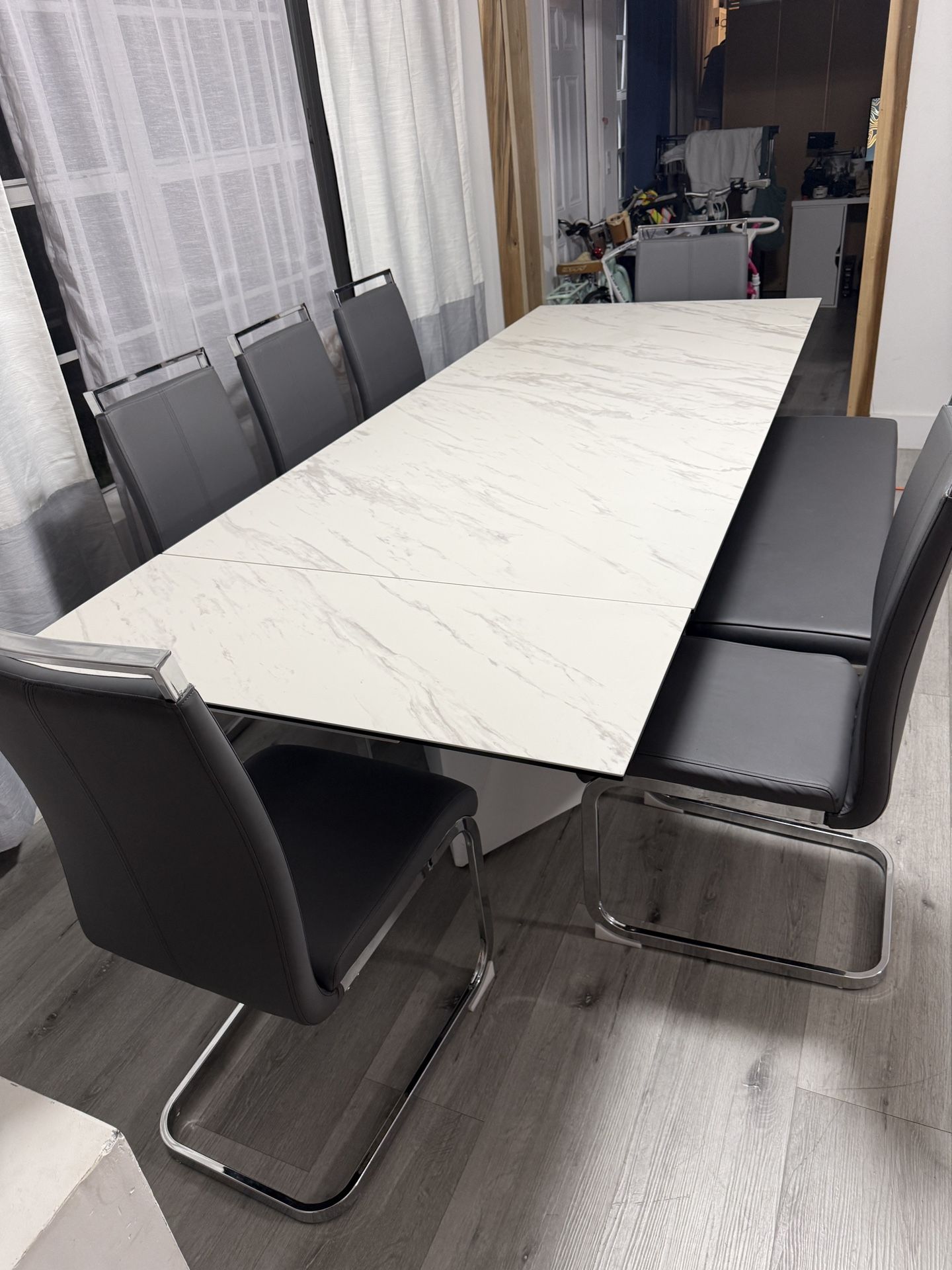 Dining table with a ceramic top 71"x39" can expand to 102.5". Comes with 5 high back chairs and a long bench. Table is heavy and solid. Great condition. We are moving soon so we do not need it anymore.