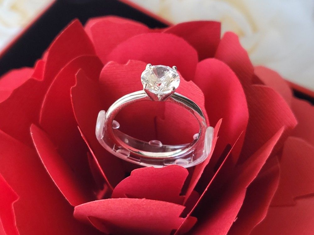 This is a Ring and gift box set. The Ring is solid sterling silver and the center gemstone is a lab grown sapphire. The Ring box doesn't look like a traditional ring box but as it opens the paper rose inside opens to show the Ring in the center. Cash only please.