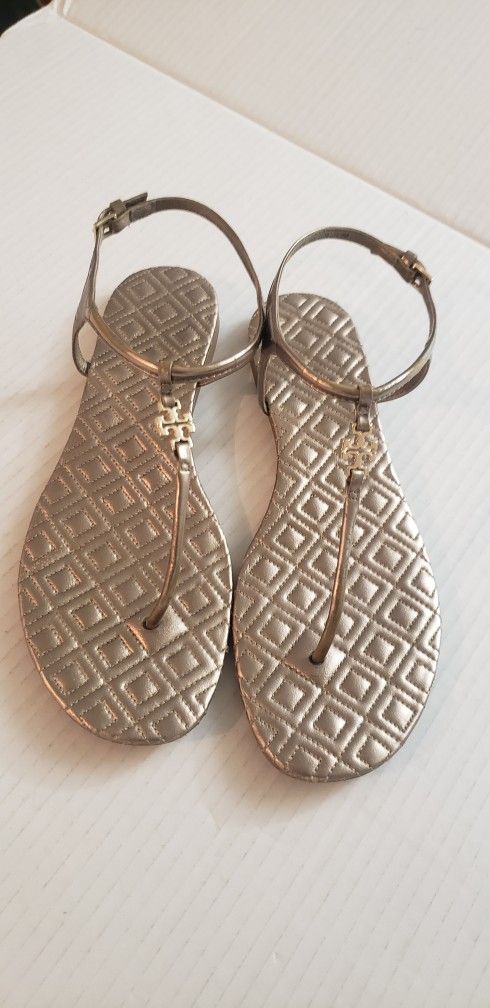 Tory Burch Marion Quilted Leather T-Strap Sandal in Mica Bronze Size 9. Regular Price $225 Polished logo accents these metallic T-strap Tory Burch sandals. -Color: mica (bronze gold) - Size: 9 - Quilted footbed - Buckle Closure - Quilted leather. - Thong toe. - Goldtone hardware. -Adjustable ankle strap with buckle closure.