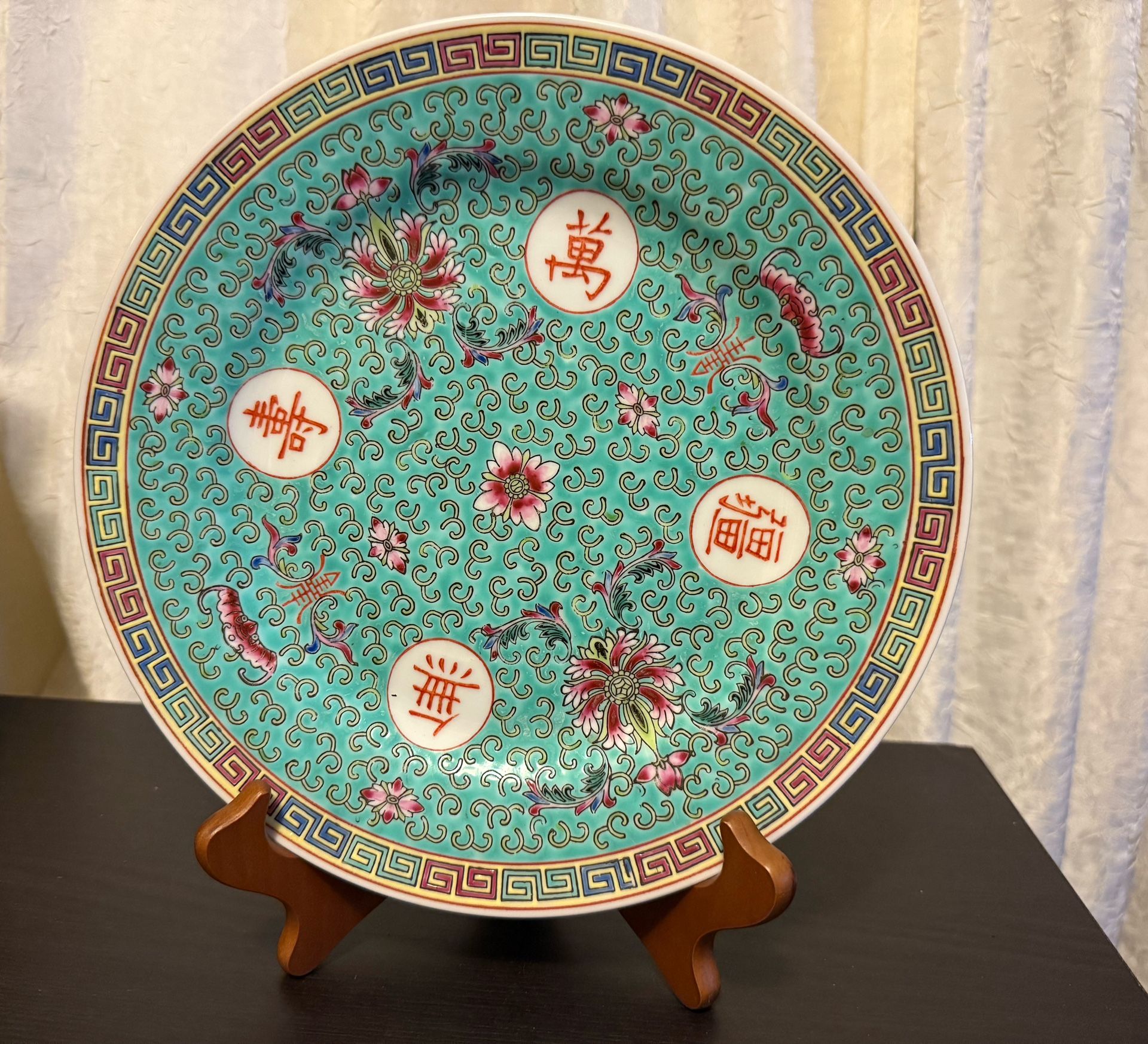 Large Vintage Chinese Longevity Turquoise Porcelain Plate