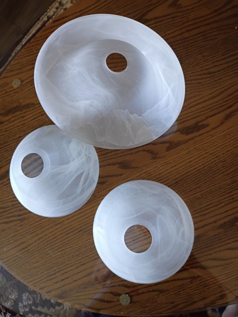 A set of three gorgeous, vintage, art glass, bell-shaped shades in a white frosted, marbled glass pattern. Two of these pretty shades are 7 1/4" wide, 4" tall with the top opening of 1 1/2"and one 10," and have some slight imperfections, as would be expected of something of this age, but that does not at all detract from their appeal. Please see photos for details as they are part of the description.