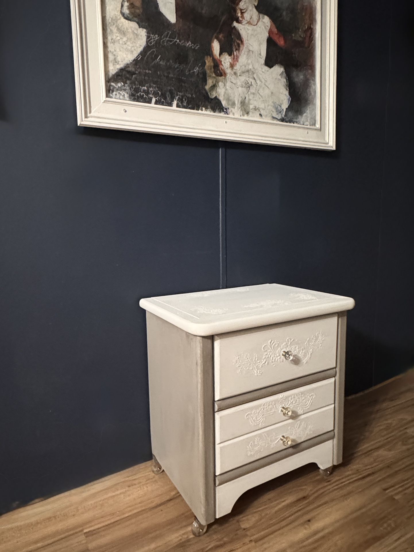 Beautiful original vintage nightstand, fully refurbished in a soft white and linen finish and sealed with a hand-applied wax topcoat. Features raised decorative drawer detailing, crystal-style knobs, and matching crystal wheels that add elegance while allowing for easy movement. A timeless piece with classic charm. Additional details: Solid wood top and drawer fronts. I replaced the back dust cover and signed the piece. Not a lightweight piece due to the solid wood construction. Dimensions: 25” H × 24” W × 15” D Perfect for a bedroom, guest room, or accent space. One of a kind.