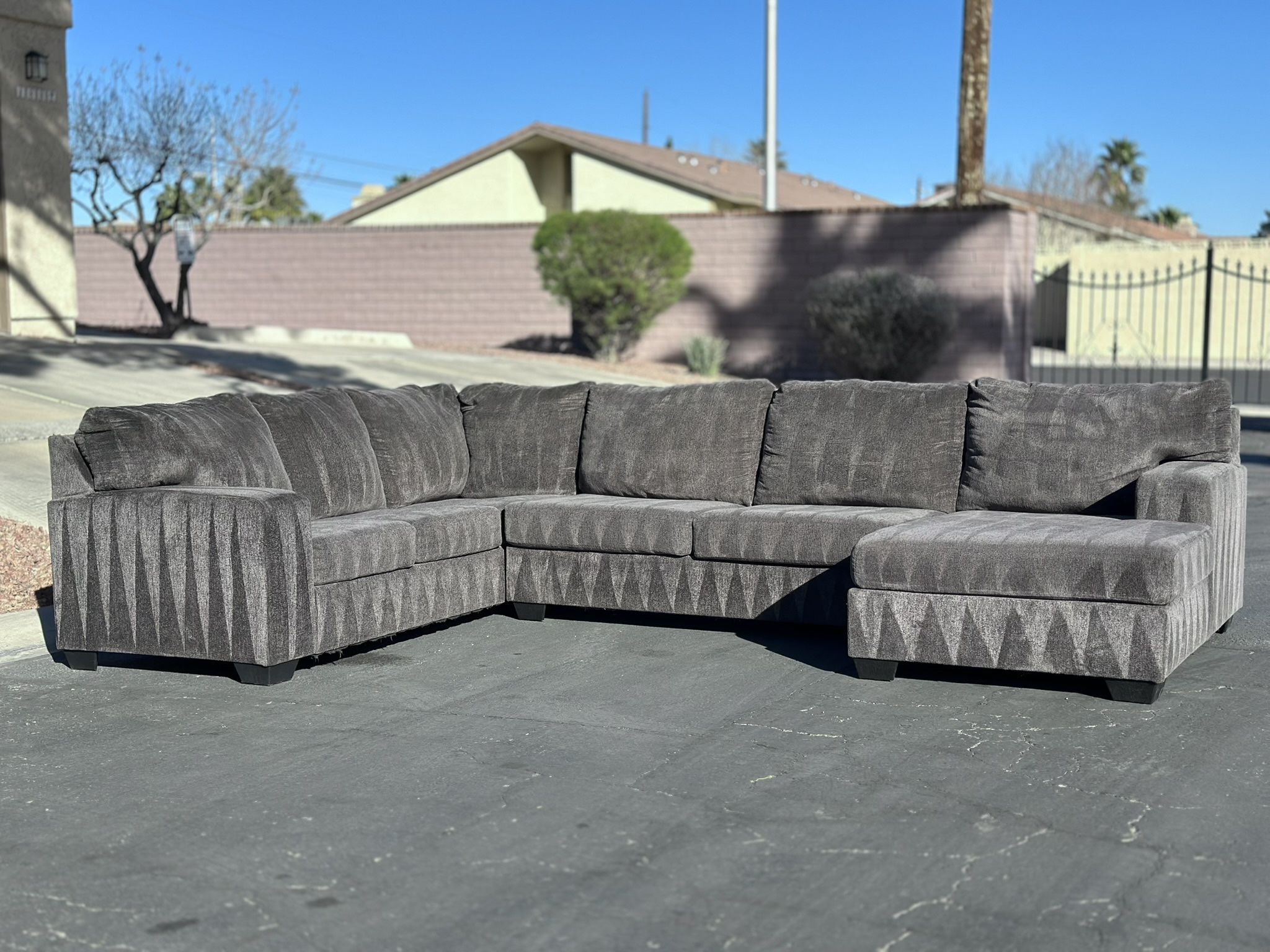 Beautiful large gray sectional from Ashley’s Furniture! Professionally cleaned and ready for its new home! 🧼 Great size perfect for entertaining and accommodating family and friends, with comfortable seating. Minor fabric work done to rear of couch, not really noticeable as shown in pictures. Perfect for someone looking for a large couch at a great price. Dimensions: Looking at couch- 93in x 141in x 60in Sitting in couch- 60in x 141in x 93in ✅ Ready for Pick Up Located Near Flamingo & Eastern or 🛻💨 Delivery Available Only in Las Vegas, NV Check: RACOZYHOMEFINDS . COM FOR MORE 🛋️‼️‼️