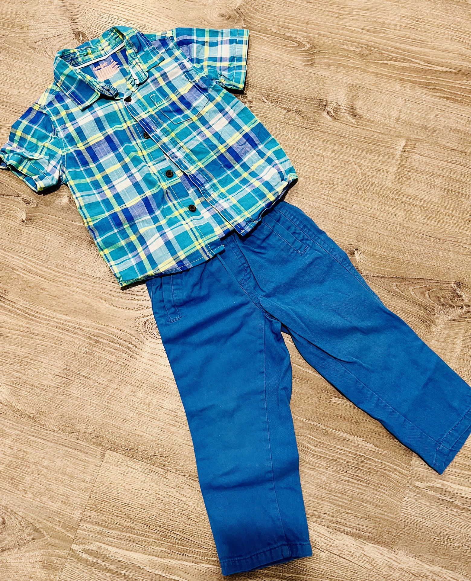 Toddler blue outfit. Cat & Jack squared shirt (size 3T). Blue pants size 3T. $10 or best.