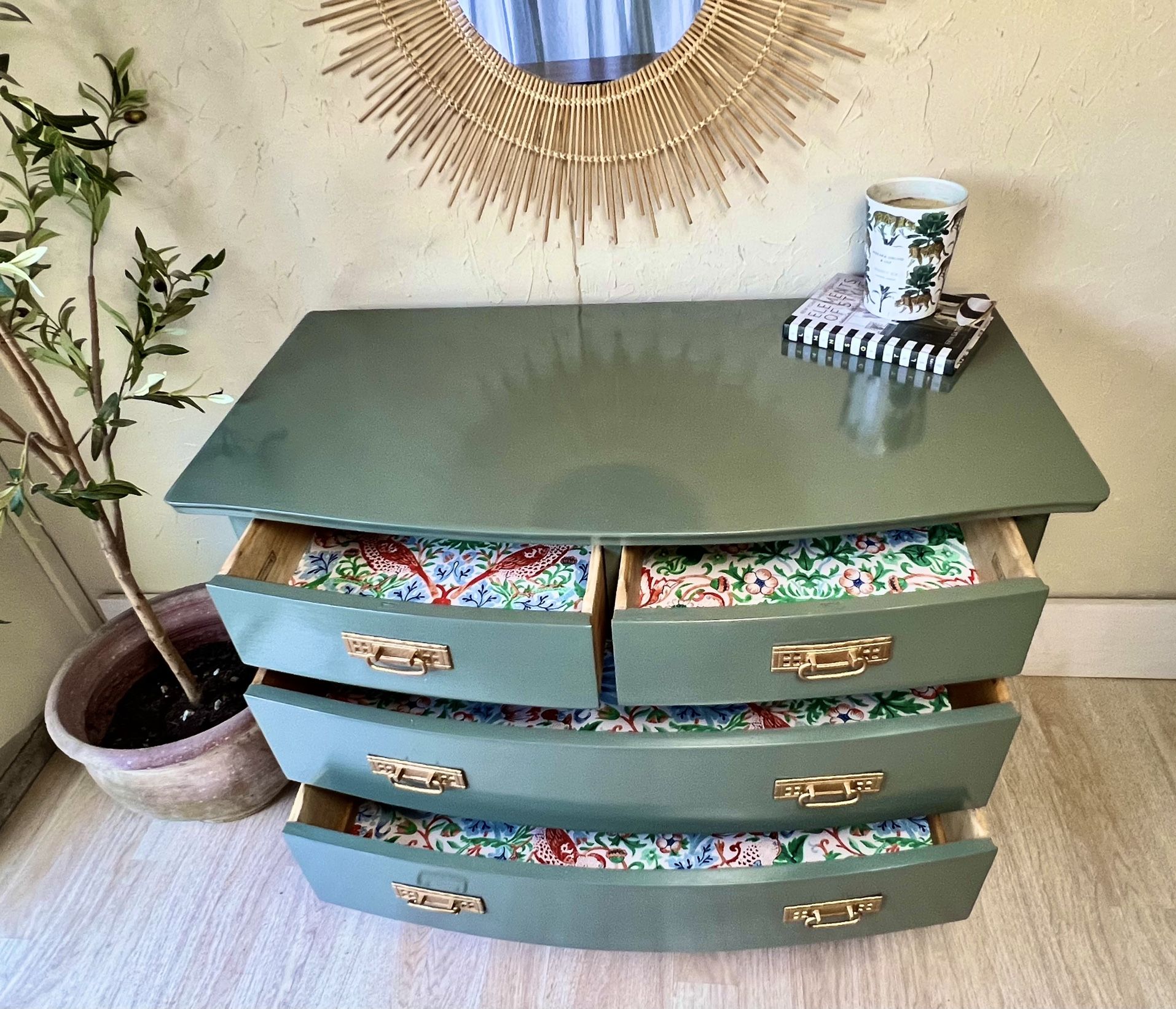Vintage bow front dresser, solid wood. Fully refinished inside and out. Painted in a professional high gloss lacquered finish. Solid brass hardware. All drawers have been sanded and waxed. They have dovetail joinery, and slide excellent. They’re lined in designer wallpaper. Dimensions: 42 1/4” W 22 3/4” D 34” H -About my work- I’ve been perfecting my craft of refinishing high quality, solid wood furniture for 9 years. I pride my work on attention to detail and providing excellent and smooth paint and stain finishes, sealed with polyurethane or lacquer. I use only non toxic, high quality products. If you have a piece you’d like refinished, Please reach out😊 I accept cash or Venmo and require a deposit to hold an item, otherwise first come first serve! All pieces are in great vintage condition and sold as is. Sales are final.
