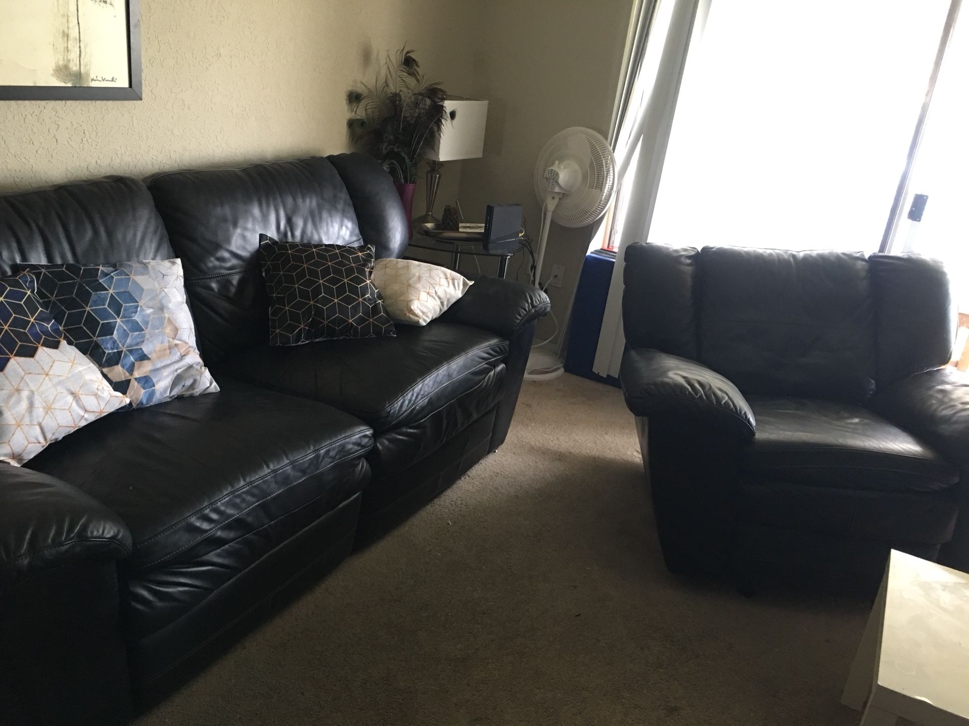 3 Pc black leather reclining sofa with 1 pc recliner.