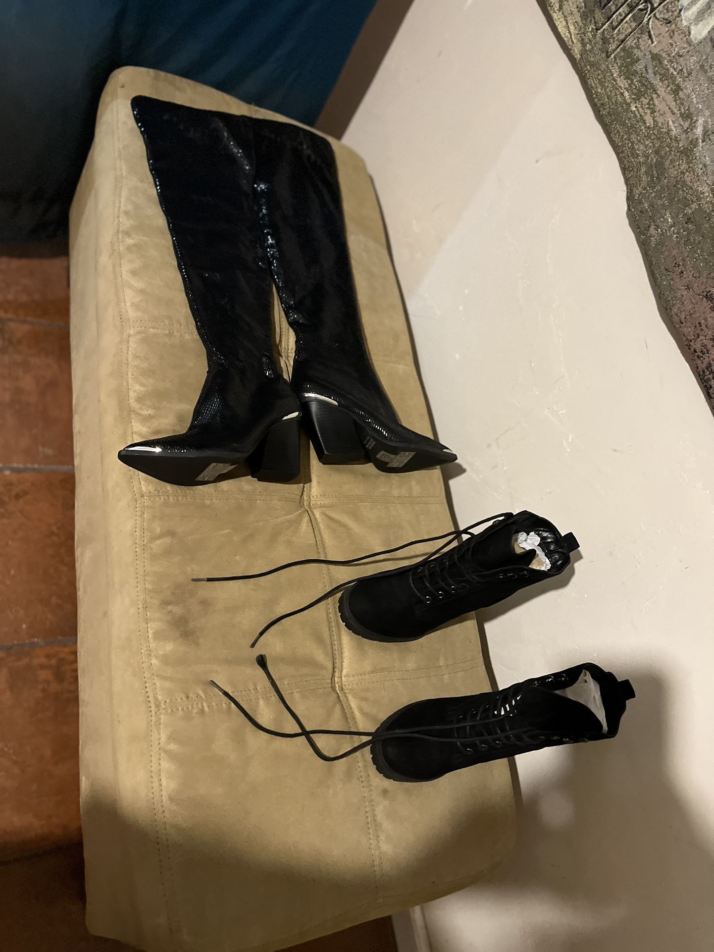 Two pairs of brand new never wore see the bottom of the shoes. They’ve never been worn. They have flaws. The tall boots are snake skin design. It has a scuff mark on the hill. See the photo with my finger in it. Short boots have a Scuff mark on the top and on the side see the pictures again with my fingers in them tall boots say that they are a six and the short ones say there are seven I’m selling this for a size 7. I am a size 6 and then tall ones do not fit them more soda fit a size 7.