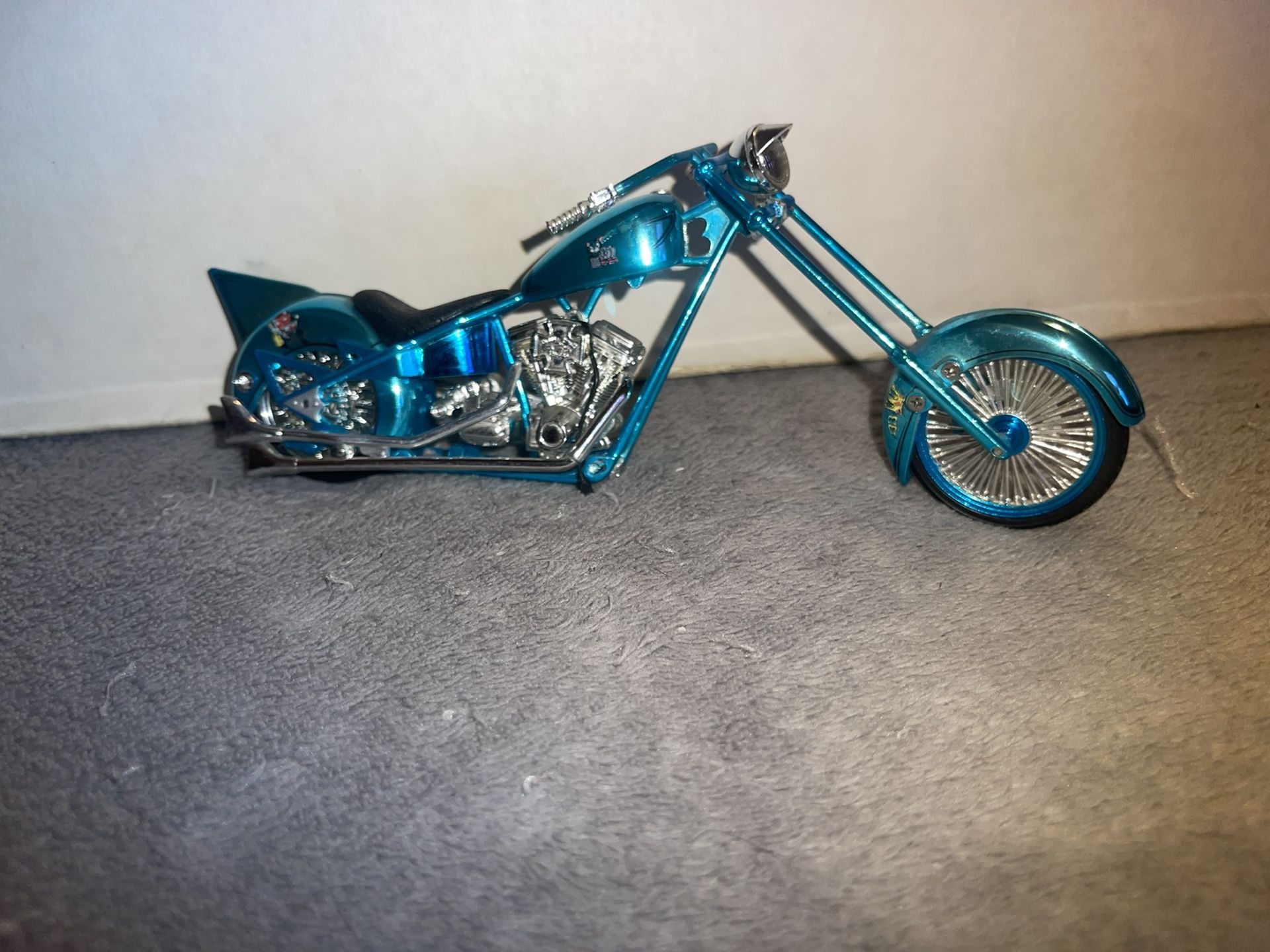 ERTL joy ride Orange County chopper replica. Unfortunately it’s missing a tail light and a handlebar but other than that it’s in pretty good condition. Would like to find a new safe home for it. Approximately 8 inches long