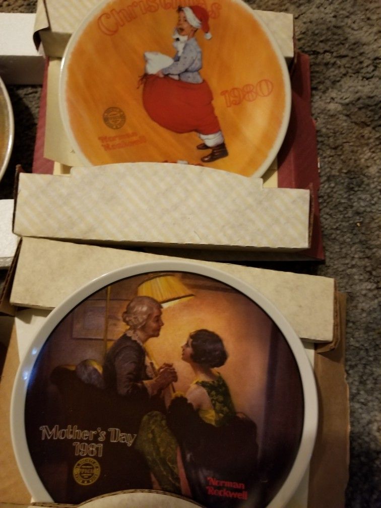 20 different plates all in box. The toy maker 1977, Golden Christmas 1976, lighthouse keepers daughter 1980, the ship builder 1980, Christmas dream 1978, Scotty plays Santa 1980,A mother's pride 1980,A mother's love 1976, After the party 1981, mischief in the hat box 1980, Christmas 1976, Somebody's up there 1979, Dreaming in the attic 1981, Music maker 1981, skating lesson 1981, Cooking lesson 1982, Reflections. 1979, toy shop windows 1977, Scotty gets his tree 1974 & wrapped up in Christmas 1981