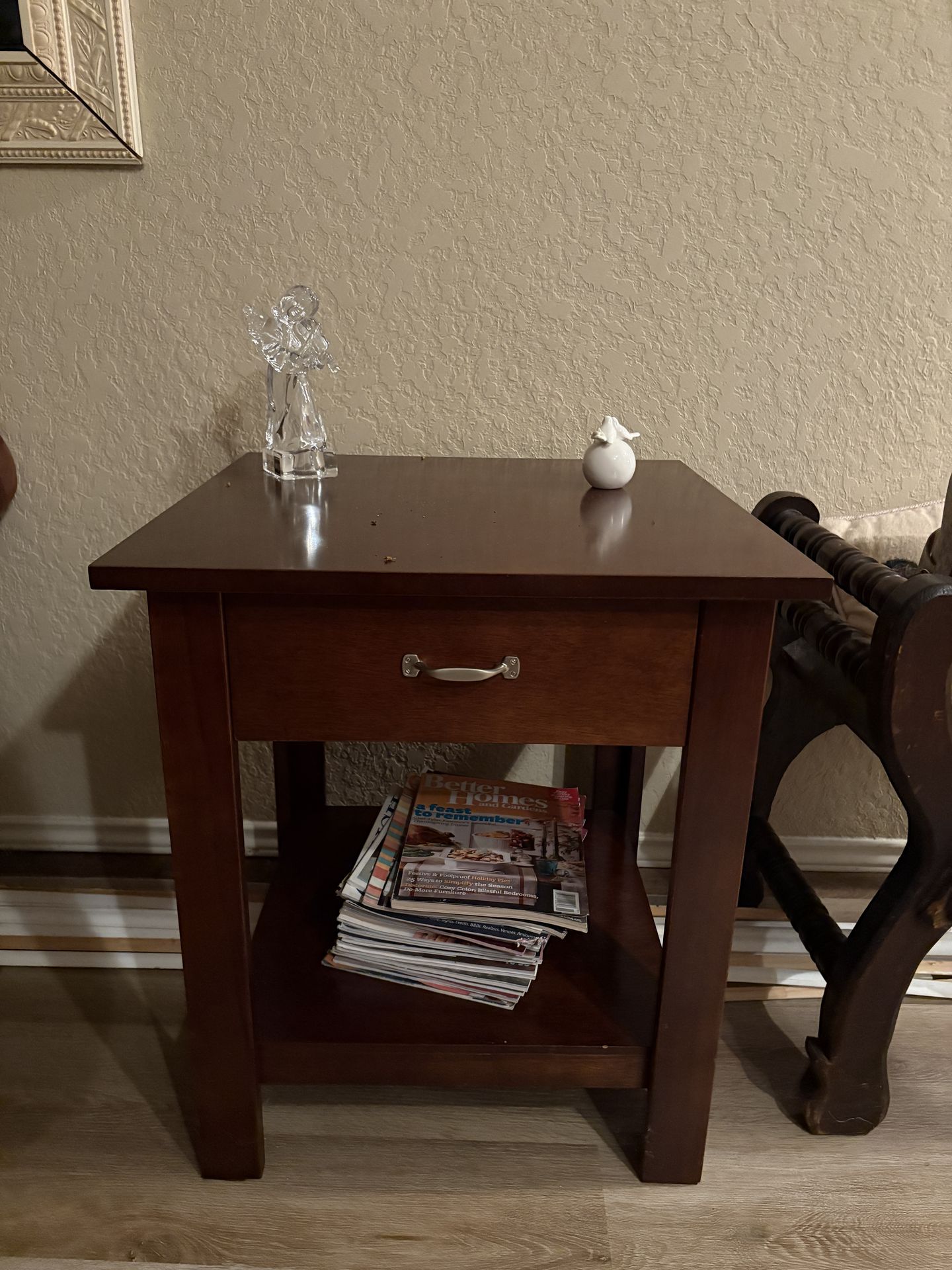 Sturdy wooden side table with a drawer and shelf.