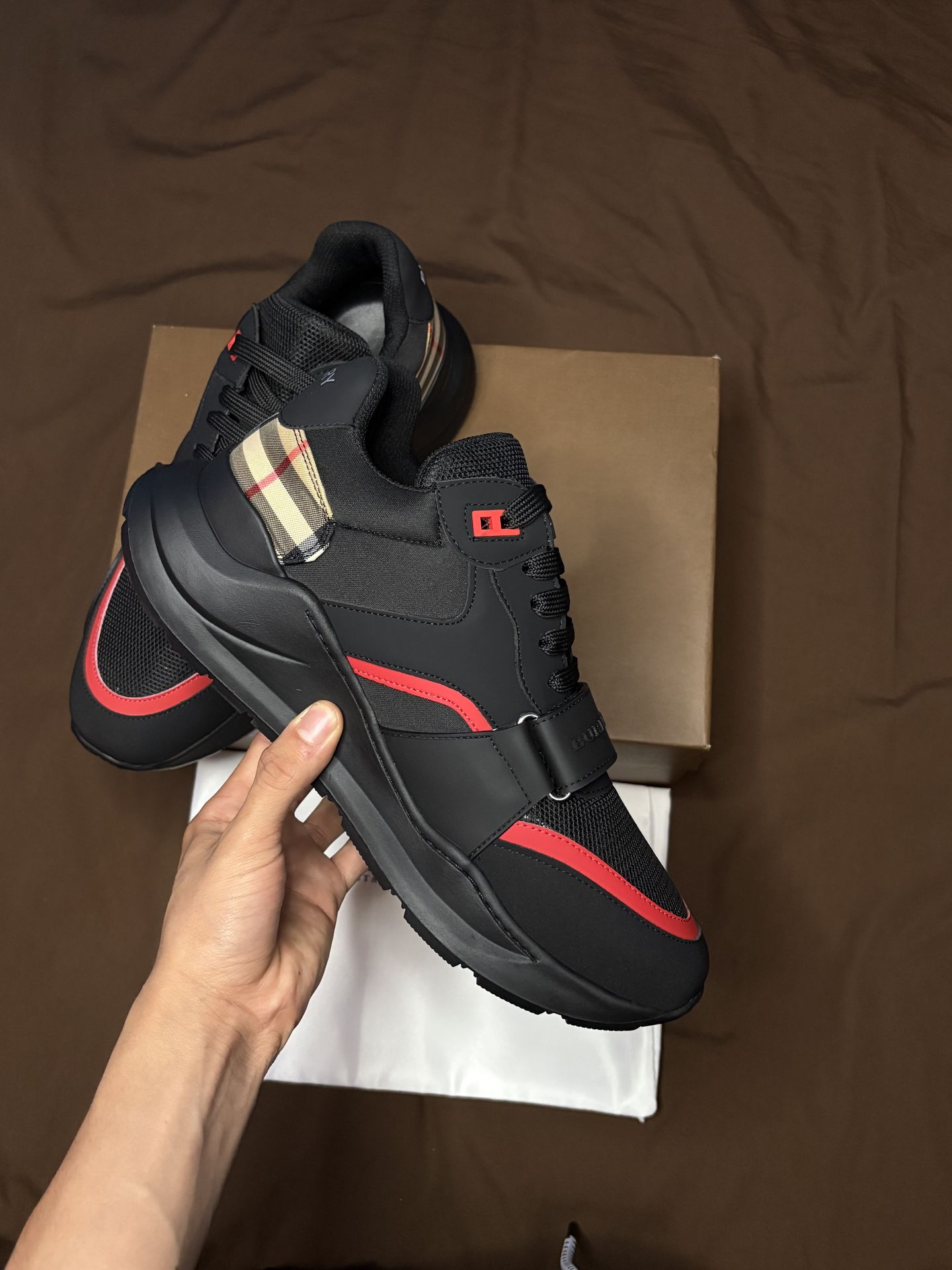 New Burberry Ramsay Men shoes available size 9. Not use Comes with dust bag Bold red accents Premium leather + mesh material Thick comfortable sole Adjustable strap detail If you have any questions feel free to message me.