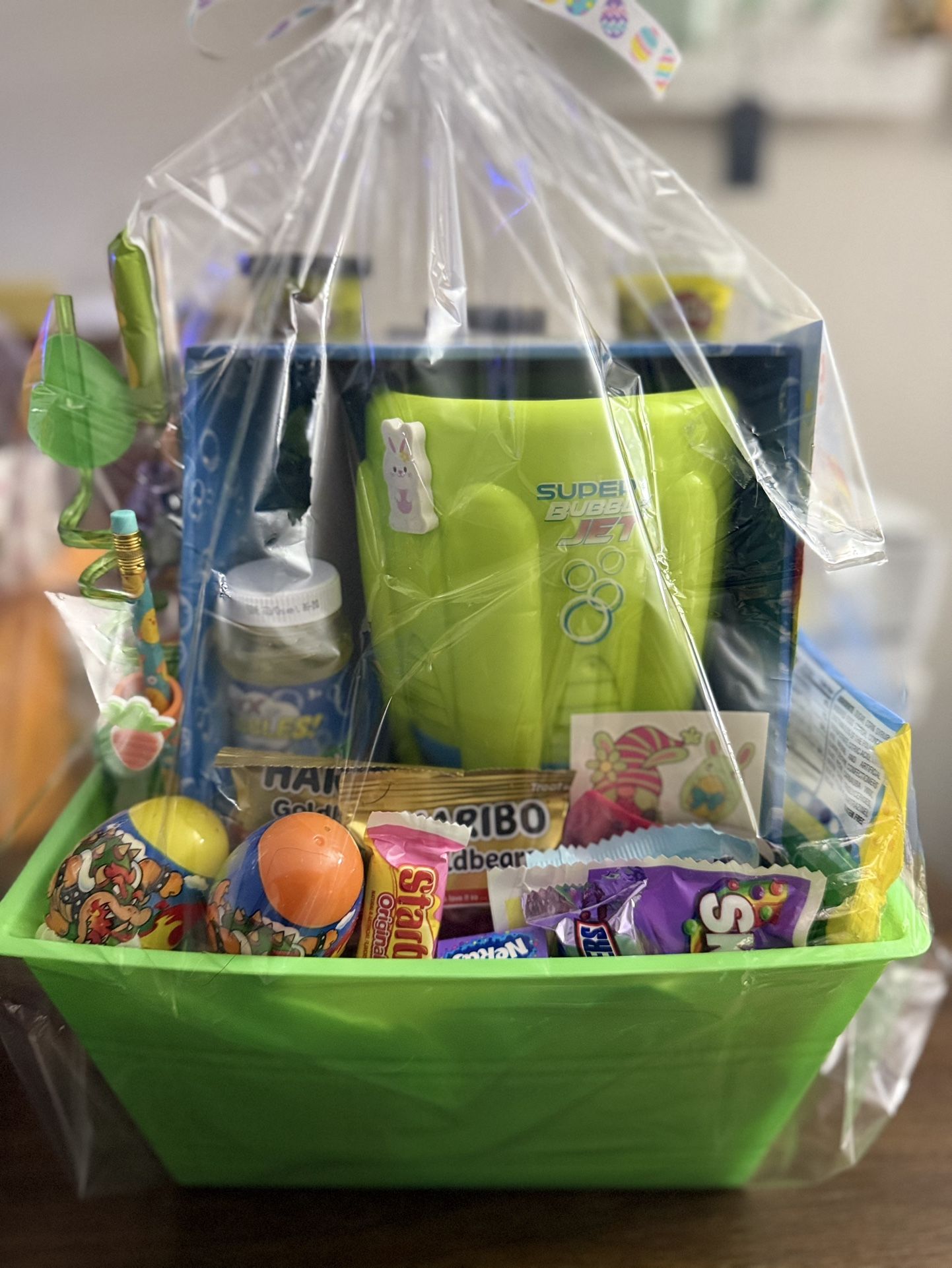 Coloring book, Notebook, Stickers ,Crayons ,Easter eggs, Candies , Bubbles , Pencil , Straw , Eraser , Sharpner , Peeps Marshmallow ,Playdoh and Bubble Jet
