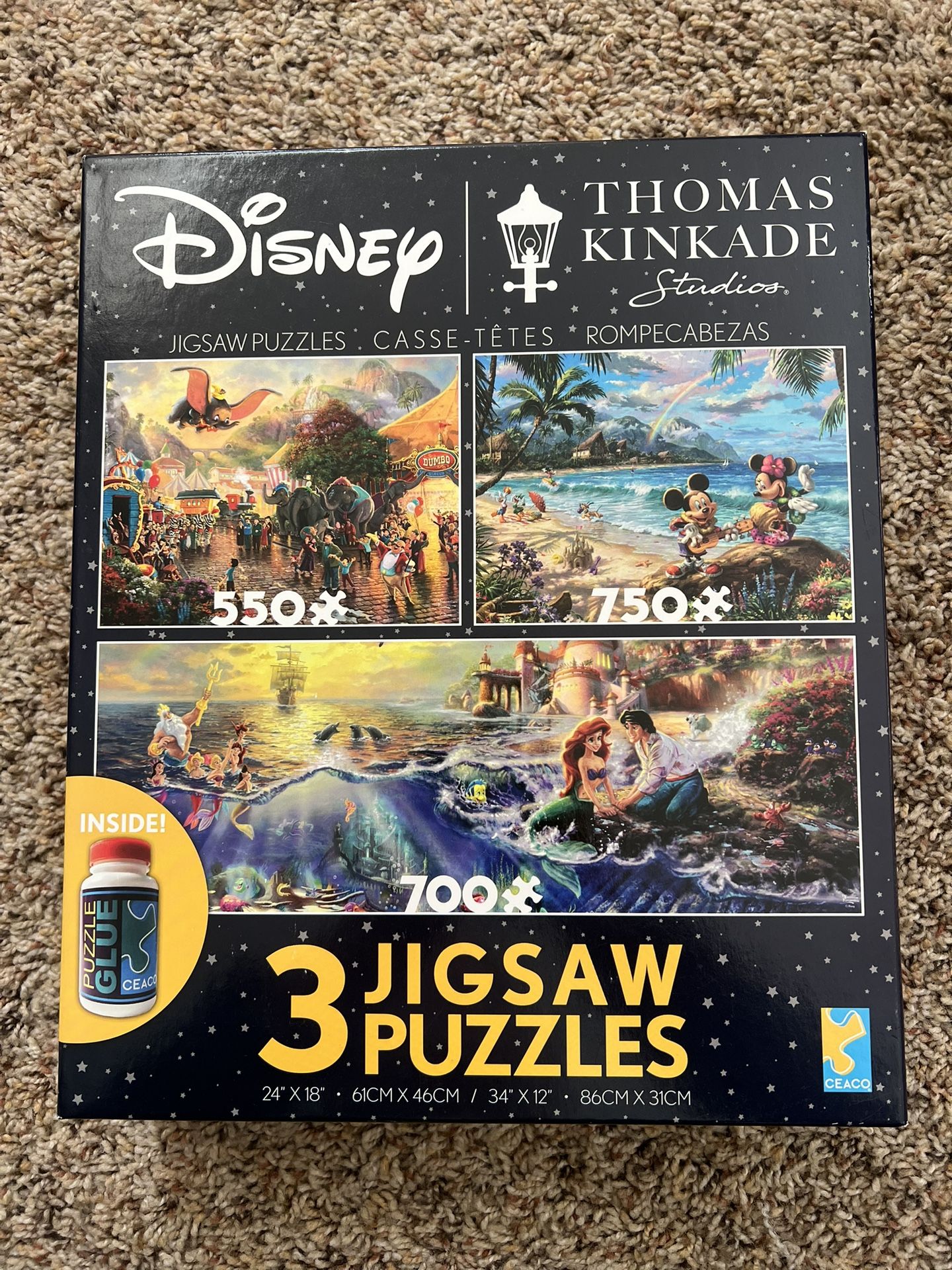 Brand new Disney | Thomas Kinkade Studios jigsaw puzzle collection by Ceaco. This beautiful set includes three high-quality puzzles featuring iconic Disney scenes illustrated in the signature Thomas Kinkade style. Dumbo mini and Mickey and Aladdin Set Includes: • 550-piece puzzle • 750-piece puzzle • 700-piece puzzle Details: • Brand new, unused • Factory sealed • Premium puzzle pieces with vibrant colors • Finished sizes: • 24” x 18” • 34” x 12” • Includes puzzle glue (inside) Perfect for Disney fans, puzzle lovers, and collectors. Great for family puzzle nights or as a gift. 15238 area willing to meet in surrounding areas