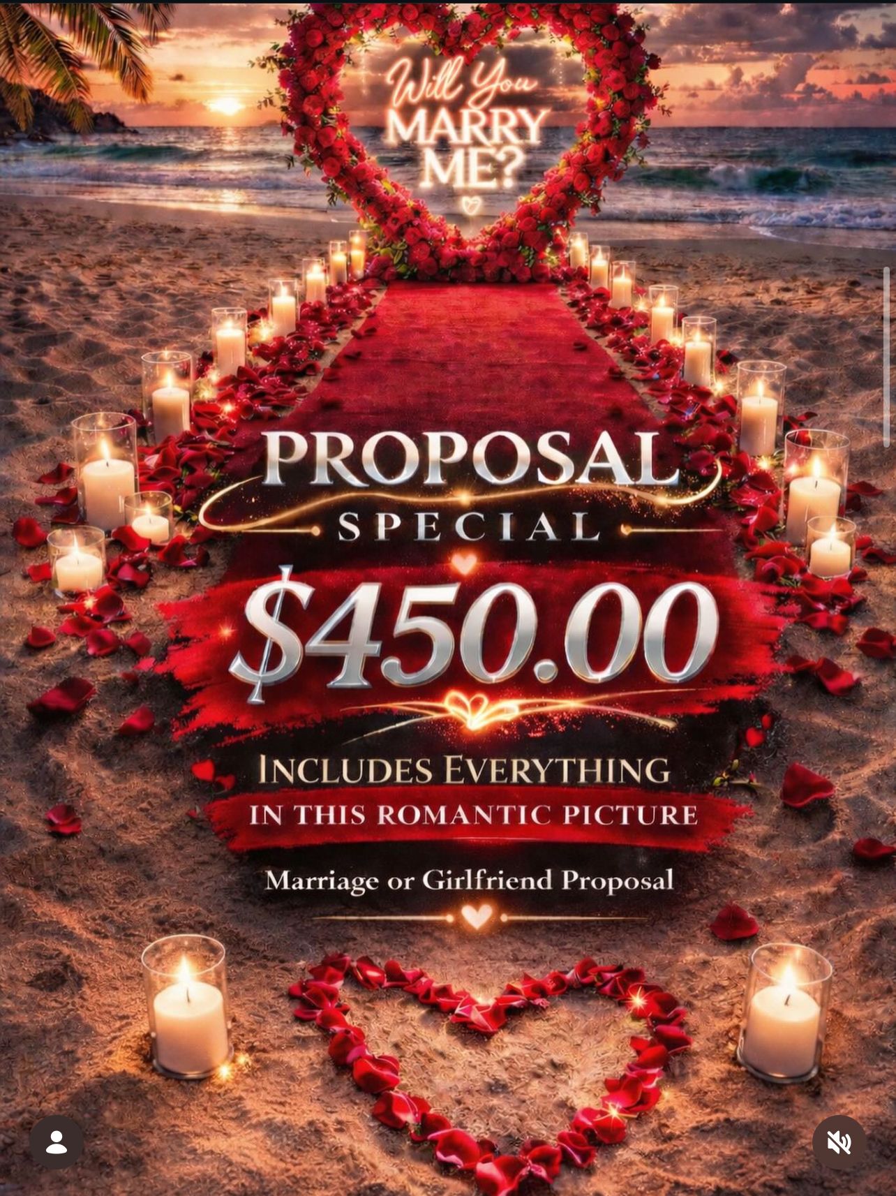 For $450 you get this entire romantic beach setup: Heart rose arch Red carpet walkway Candles & rose petals "Will You Marry Me" "Will you be my Girlfriend" sign We handle everything. You handle the "Will you...?" Limited dates available. DM. JJ Luxury Decor Proposals now to book your unforgettable moment