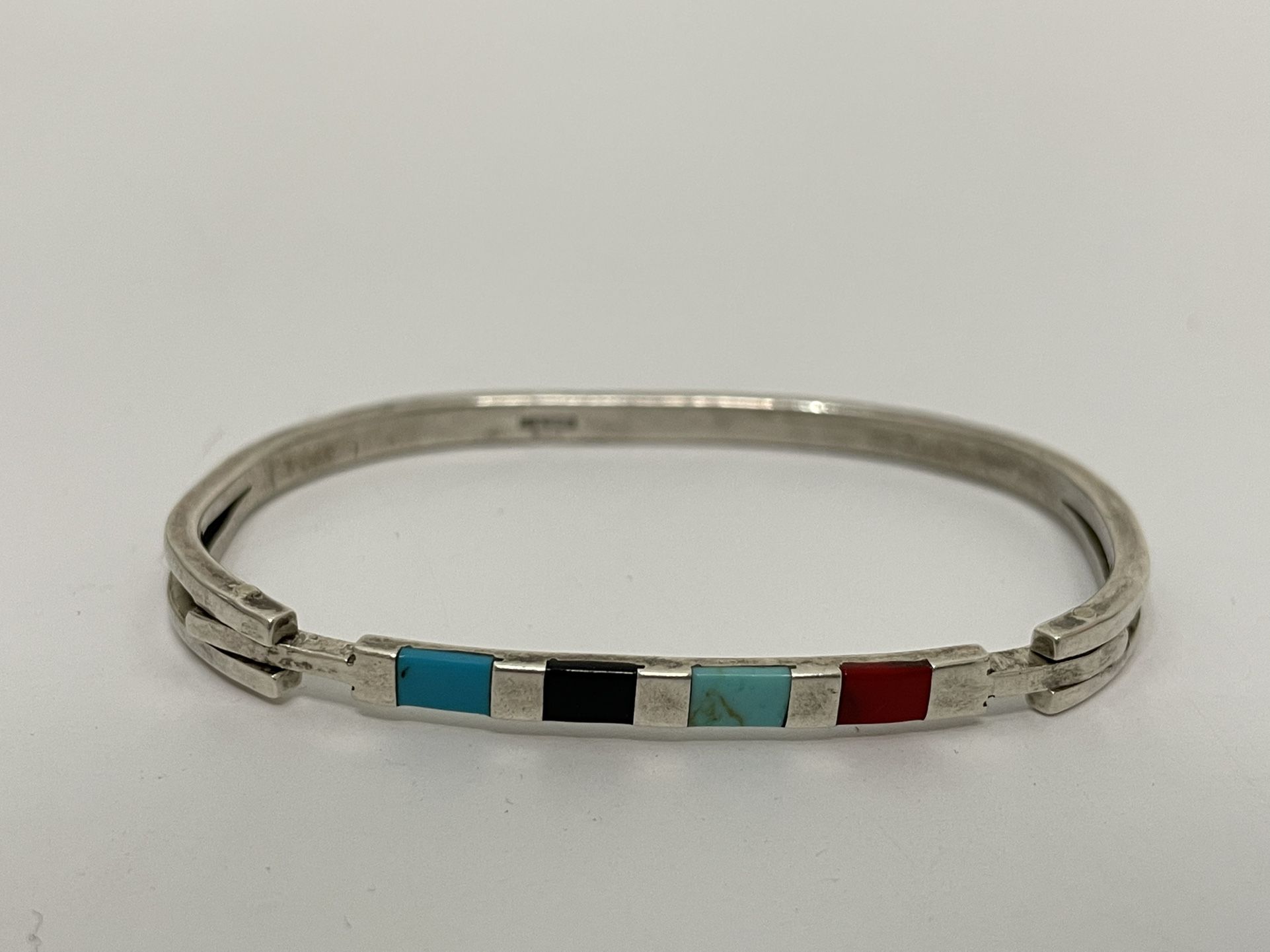 Vintage Mexico 925 Sterling Silver Turquoise Multi Stone Inlay Bangle Bracelet