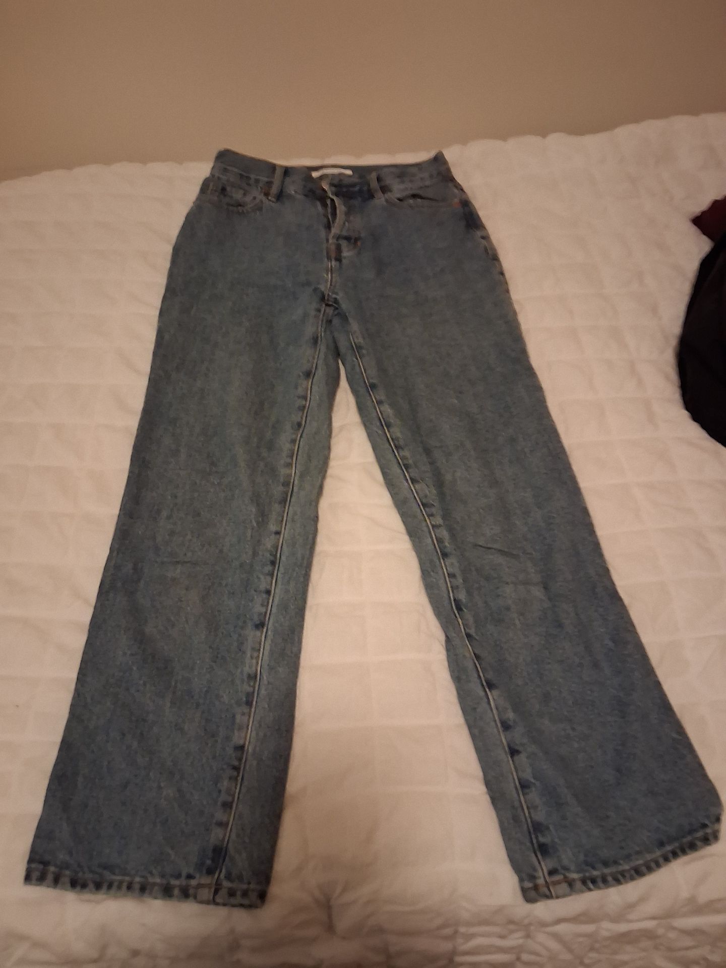 Blue, size 25, High rise straight. Like new. Button fly.