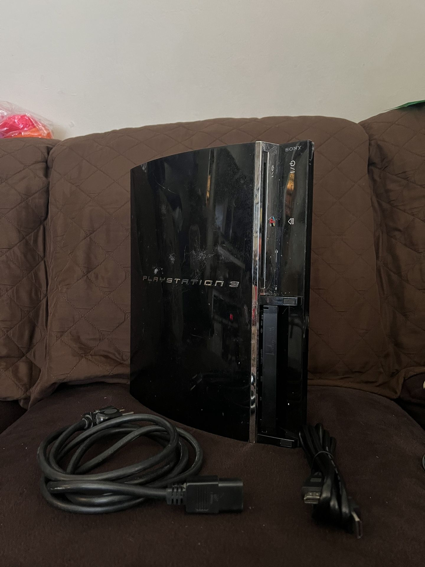 Turns on, seem to have a glitches on the screen with small red dots. Doesn’t read disc, make a noise when trying to insert a disc. Comes with Ps3 Power cable And HDMI Selling as is Cash only
