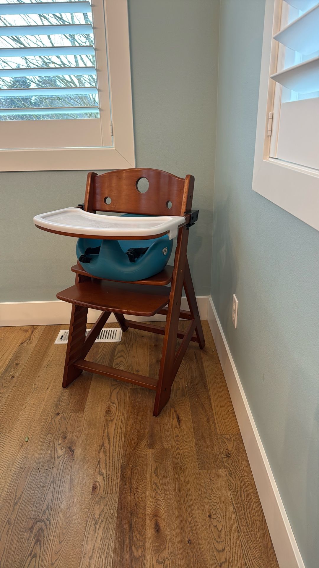Keekaroo wood transitional seating. Removable foam seat. 2 adjustable platforms with buckle straps on the seat. Wood tray with clip on plastic tray.