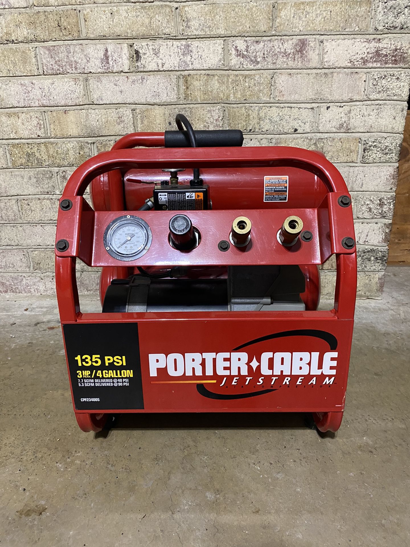 Porter Cable electric oil-free air compressor. This unit has a 4 gallon stacked tank with 11.9 max CFM (7.7 SCFM @ 40 PSI and 5.3 SCFM @ 90 PSI). It’s incredibly powerful for its size. It’s always been stored indoors (garage) and is in excellent physical and operational condition. Original owner’s manual included in the sale. Retail price was around $450, asking $225.
