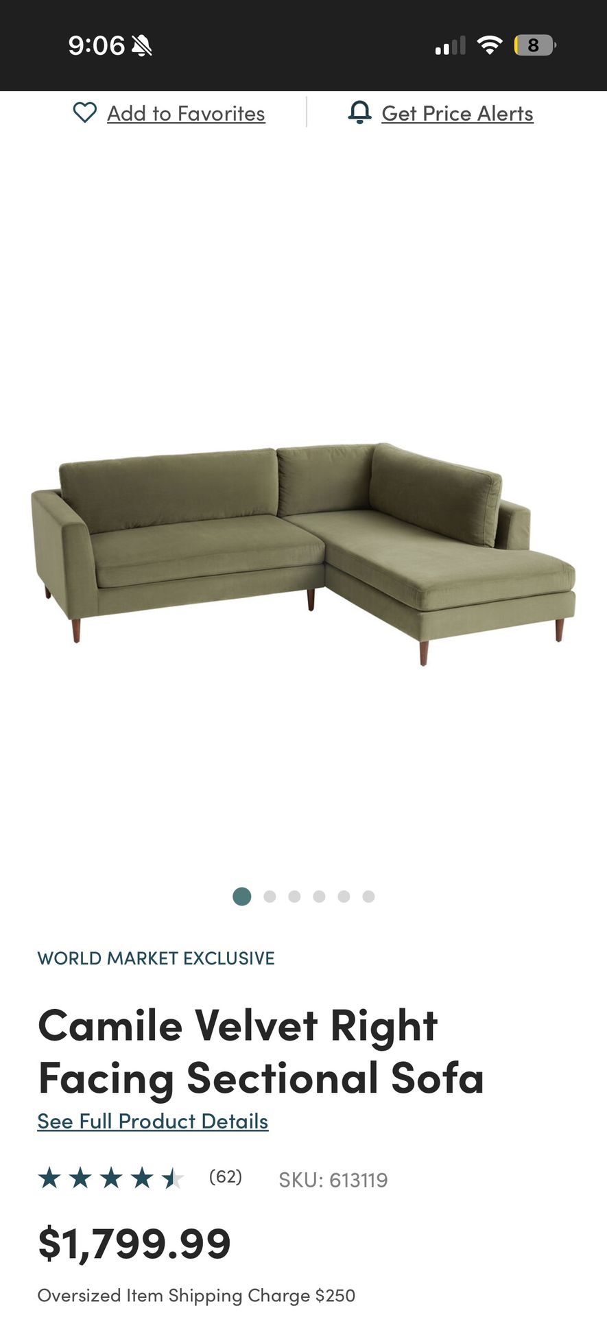 Sage green Camile Velvet Right Facing Sectional Sofa (World Market)