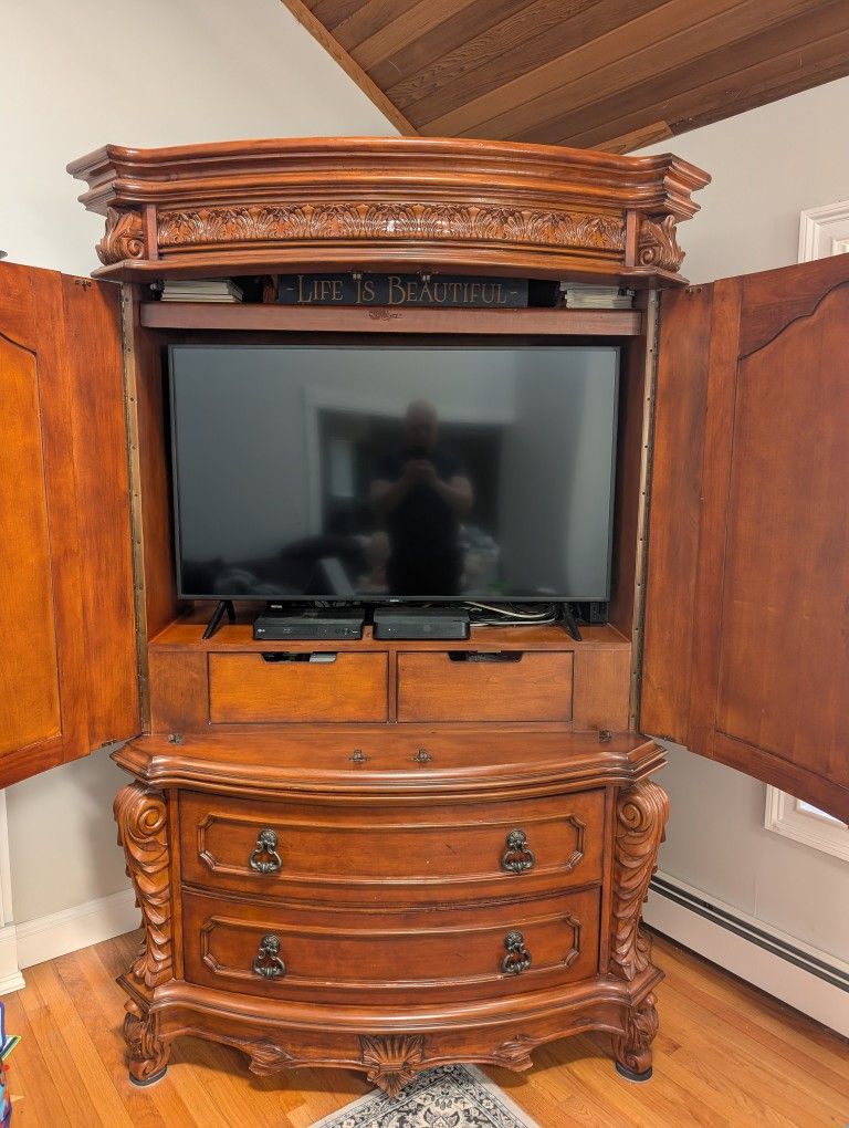 Large wooden armoire style entertainment center consists of a top and bottom portion. The top features two drawers (under tv platform) and a shelf (above the tv). The bottom features two large drawers. The ornate pulls and wood carvings make this beautiful piece stand out in a room. Fits 50" TV, can include the one pictured for additional money. Dimensions: 84" tall, 54" wide, 28" deep