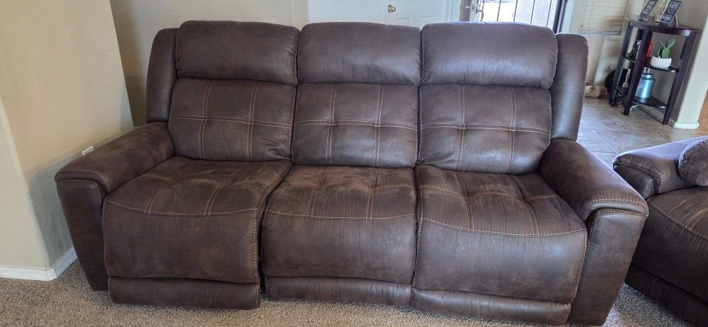 Selling all 3 pieces for $350. I have plug for sofa recliner. I have a remote battery pack for wherever you want to recline. One side of love seat has broken motor but it does still pop footrest out. Gilbert and Elliot. Dogs have been on them. Not full of dog hair though.