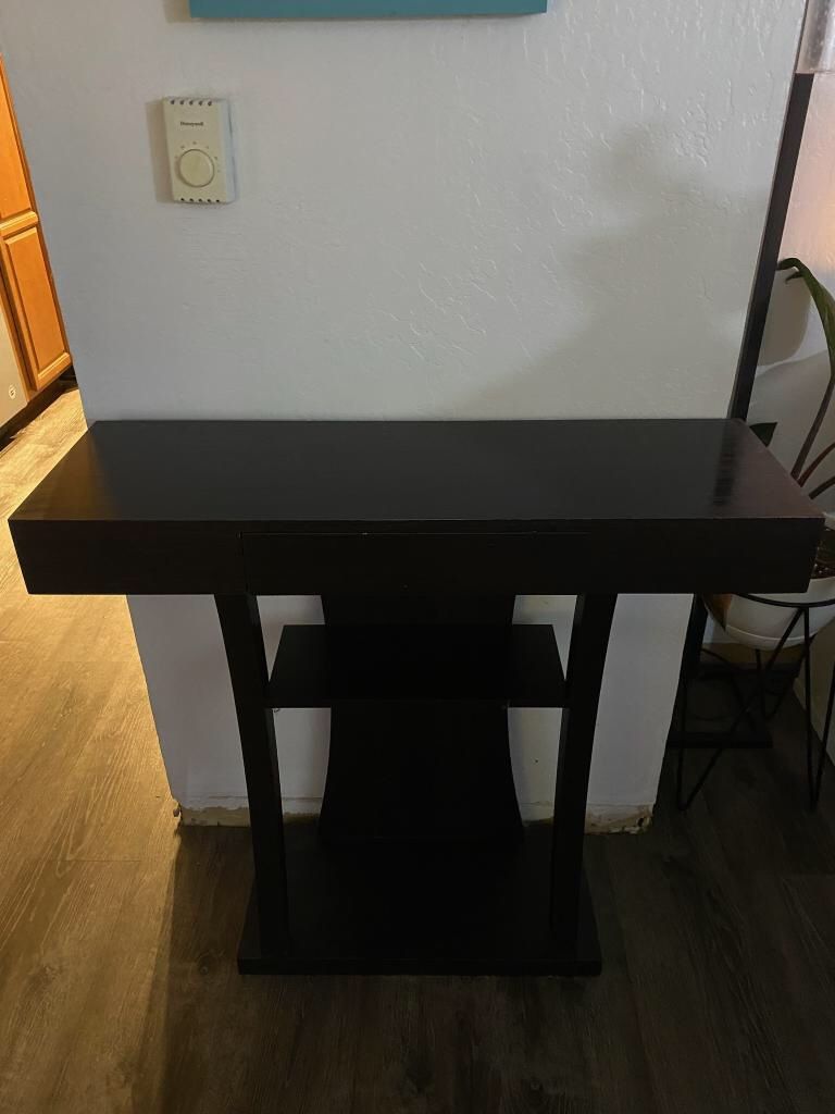 Stylish modern entry table. Few minor scratches, enlarged in photos. Hardly noticeable. Laminate. Located in tacoma/Lakewood/UP area.