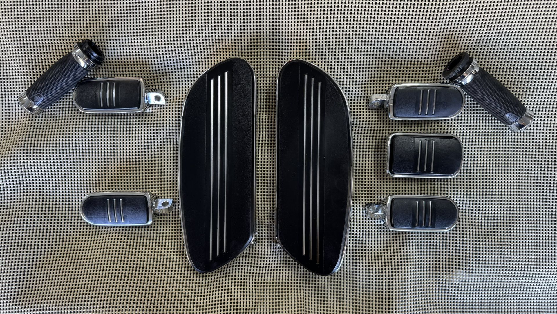 Harley Davidson OEM Matching set Handel bar throttle grips, Footboards, brake Pedal,rear Passenger Pegs & “or”Highway Bar” Pegs all in excellent used condition. Removed and swapped from My ‘14 street Glide Special at 800miles and stored properly. OEM Seat also available on my other listing and was swapped out at 500miles. MSRP For all at dealership would be $688.75 pre tax. Here you get all for $50.00 Footboards PT NM: 50631-04 Brake pedal pad PT NM: 42712-04 Footpeg PT MM: 50211-04 Handgrip PT NM: (contact info removed)2 Confirm fitment for your application with your local HD Dealership. Fits '06-'17 Dyna, 'O0-later Softail (except FXDRS) and '86-later FL Touring models. May fit other models. If you have some spare time, please see my other Items. Thank You for looking.