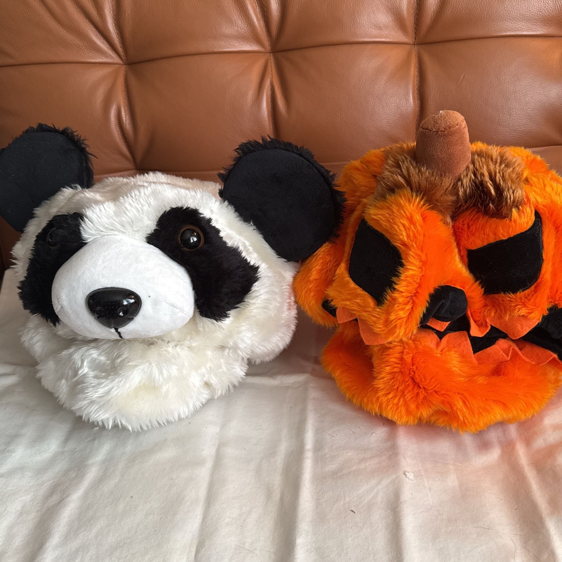 2 plush motorcycles helmet covers. Pumpkin and panda.