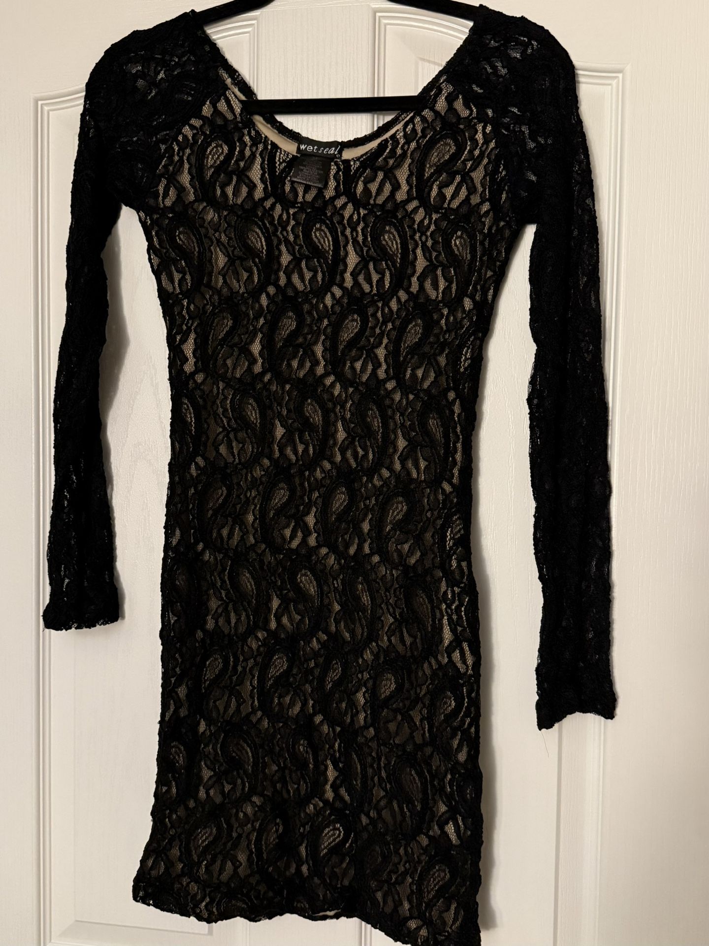 This black lace dress has long sleeves and falls above the knee. The brand is Wet Seal and it’s a size Medium. It’s a bodycon style.