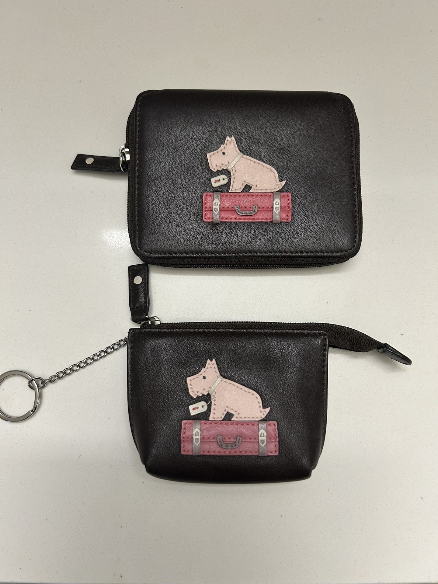 Brown leather cute Radley card/bill case and coin purse with key and drivers license holder, lined with pink fabric. Displaying famous Radley dog with his traveling suitcase. Card case measures 4.5”W x 3.5”H x 0.75”D (when closed), coin purse 3.75”W (at top) x 3”H x 1.5”D (at top when open).