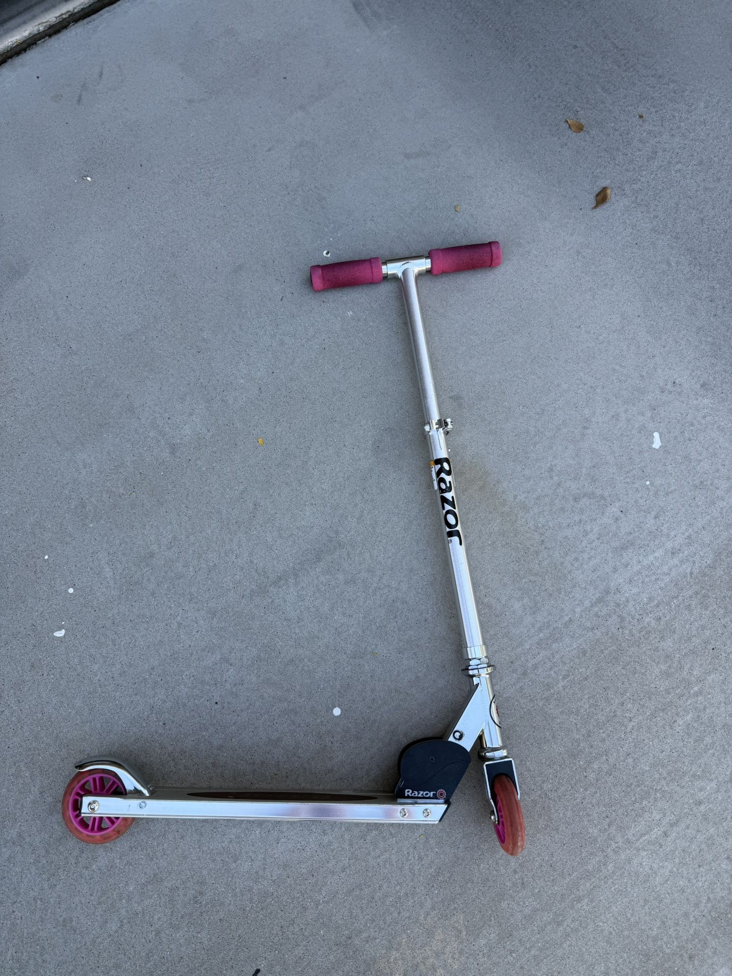 Razor Kick Scooter – Classic Folding, Lightweight Pickup in Chandler. Cash or Zelle accepted. Classic Razor kick scooter in good working condition. Lightweight and easy to carry—great for kids. Folds up quickly Smooth-rolling wheels Pink grips and wheels for a fun look Some normal wear from use Everything works as it should—ready to ride! Other Special Features of the Product Adjustable Handlebar Height, Foldable Weight Capacity Maximum 143 Pounds Number of Wheels 2 Handlebar Type Adjustable Wheel Type Solid Suspension Type Rear Suspension Grip Type Foam Brake Style Rear Braking