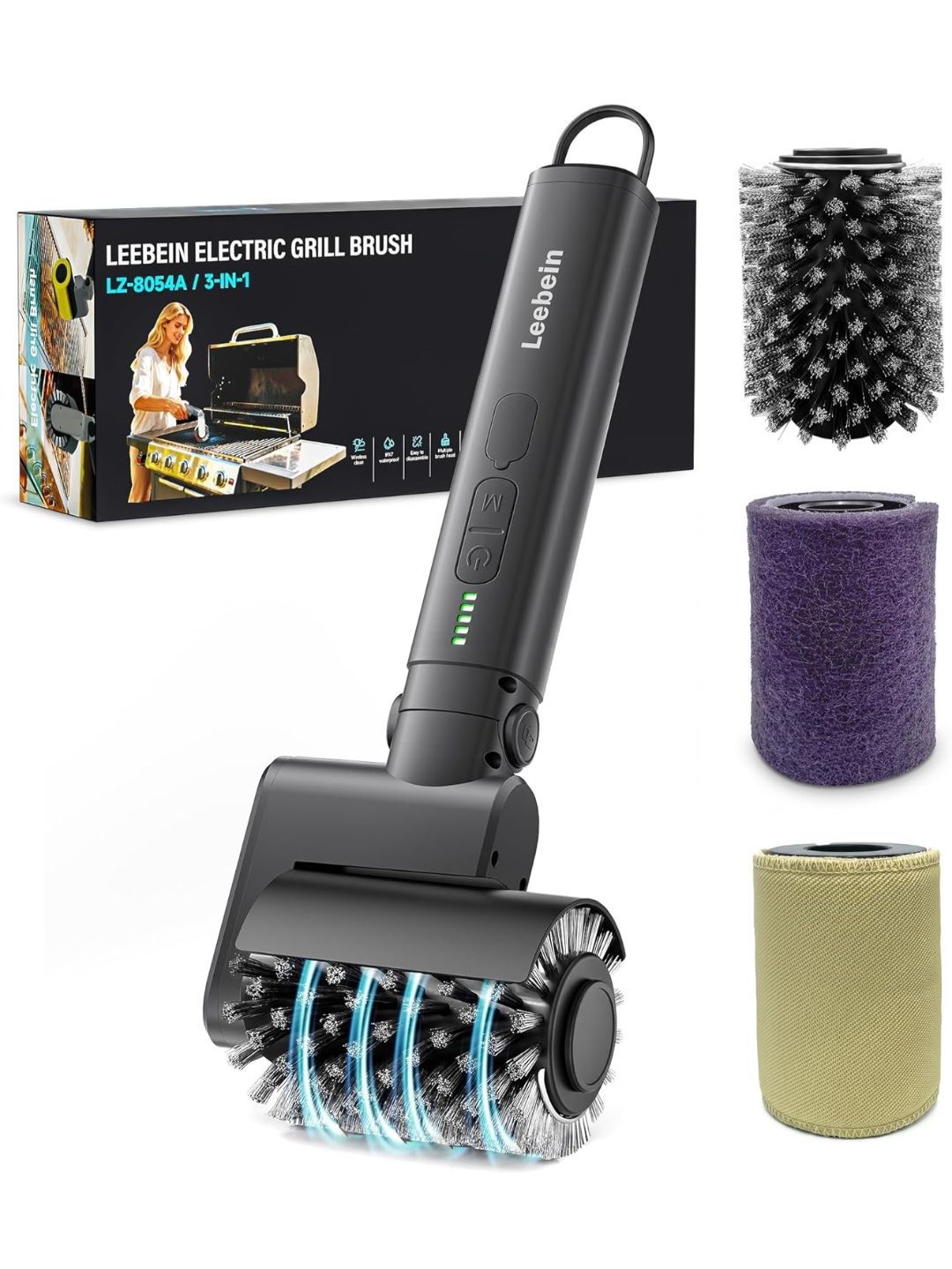 Leebein Electric Grill Brush for Outdoor, 2026 Upgraded BBQ Grill Cleaner with 3 Heads, 3-Speed & Angle Adjust Cordless Rotary Grill Brush, 150 Mins R